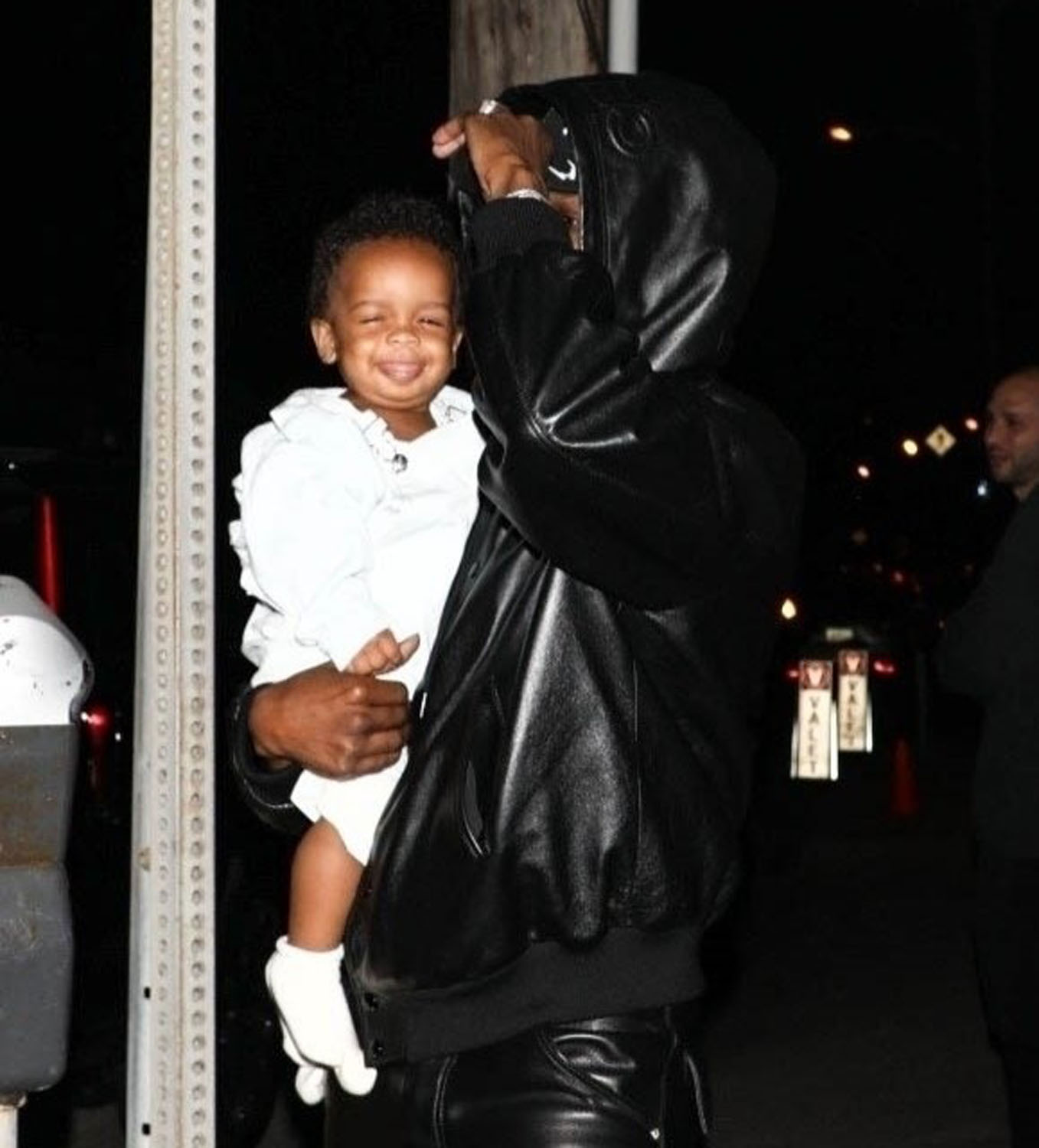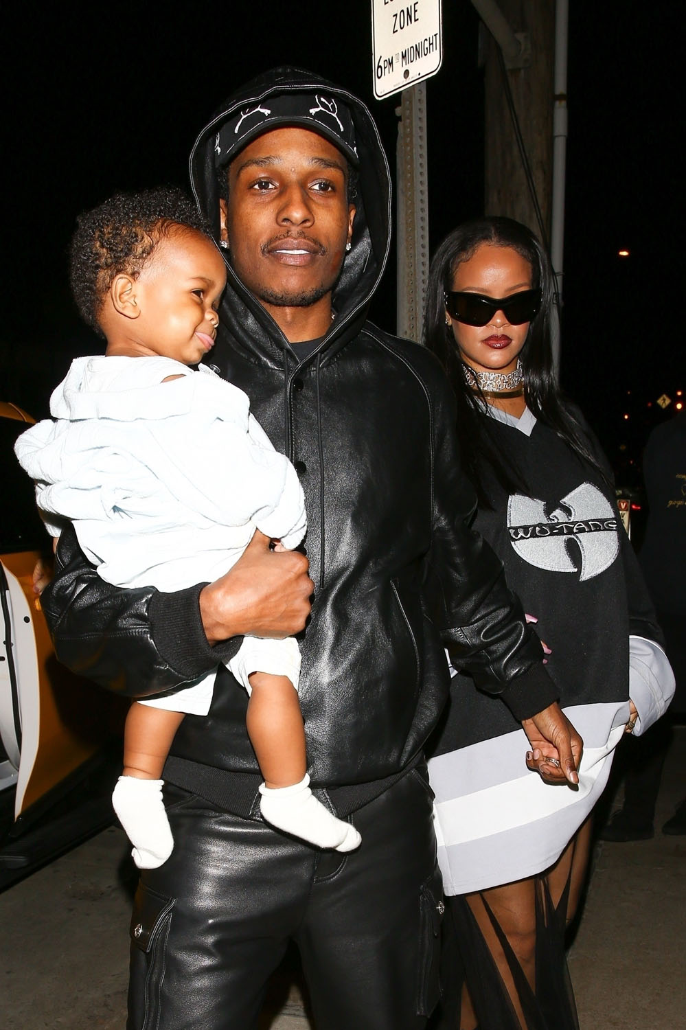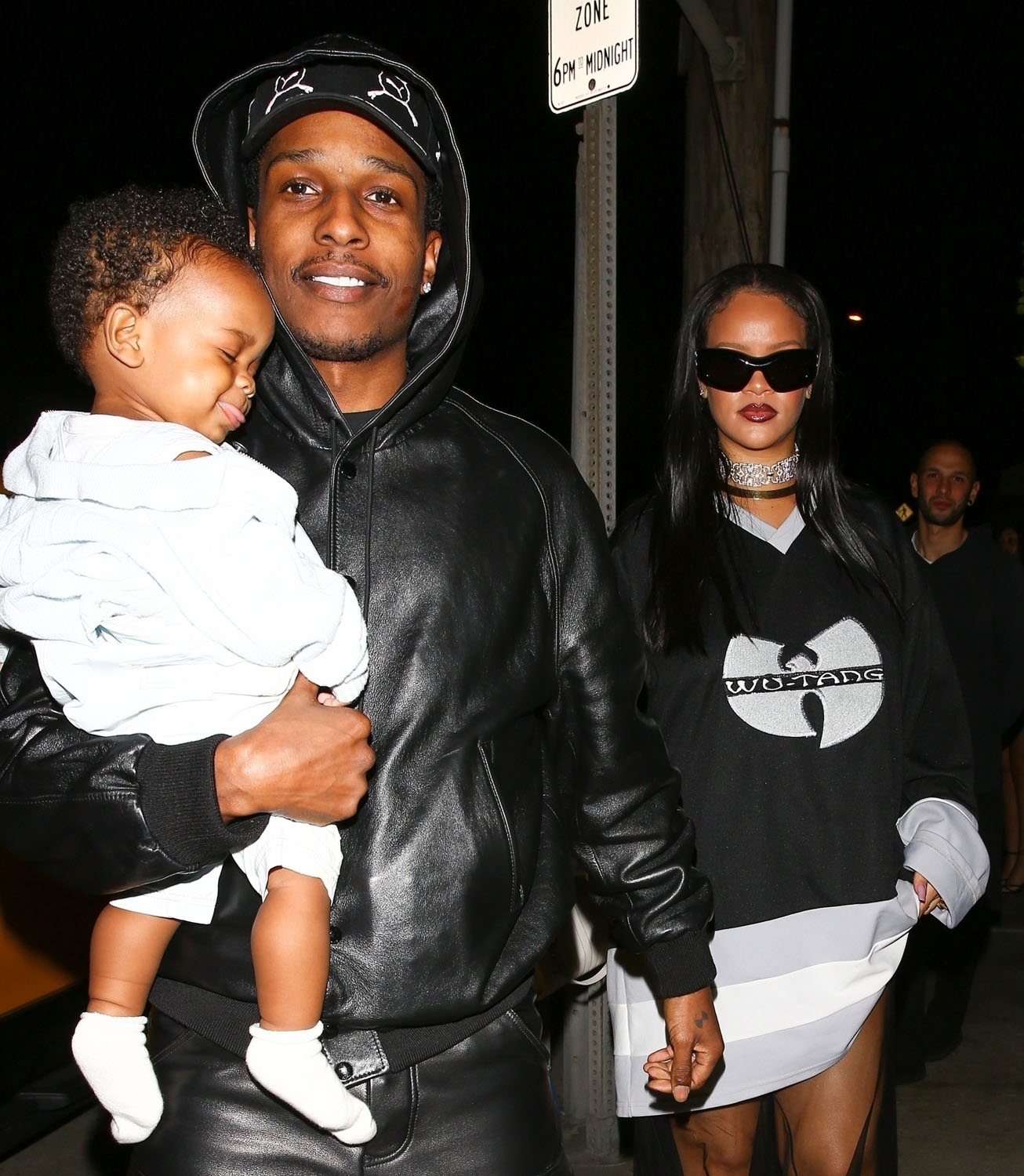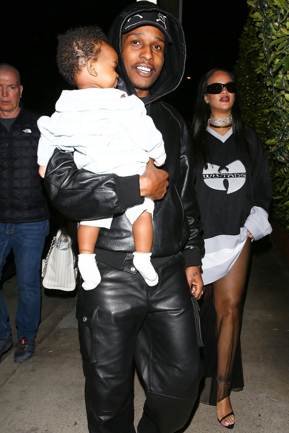 We’ve been seeing more and more of this lately. Rihanna took her baby to the studio recently from night to morning and now she’s bringing him along when she needs her pasta fix in person. As I noted last week when she picked up her food via drive-thru, it could have been because she didn’t feel like getting hair and makeup ready to eat. Obviously that wasn’t a factor this time because everything is working from top to bottom – the sheer dress under the Wu-Tang jersey and all the accessories and strappy heels, RiRi is always putting on a fashion show. And, you will note, the show involves all three of them, because she, Rocky, and the baby are all coordinated in black and white.