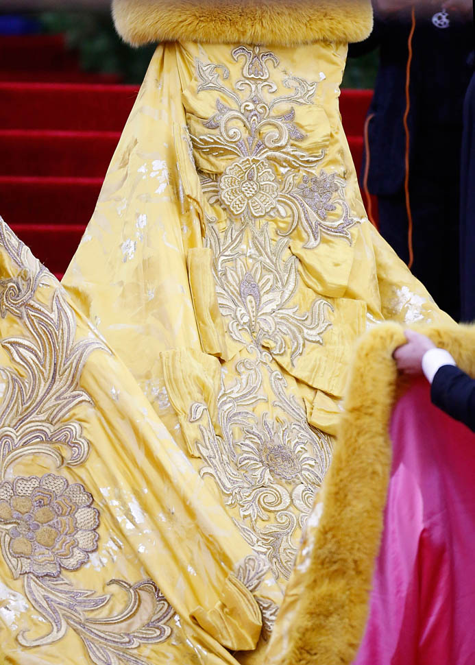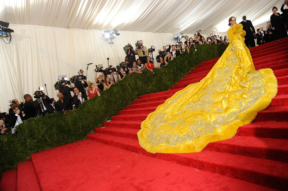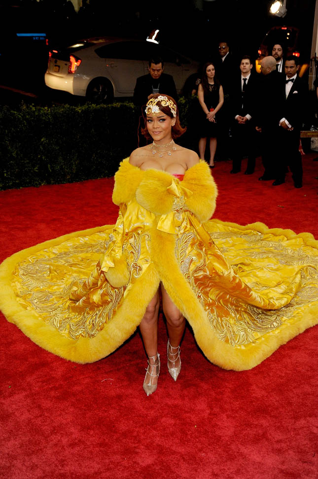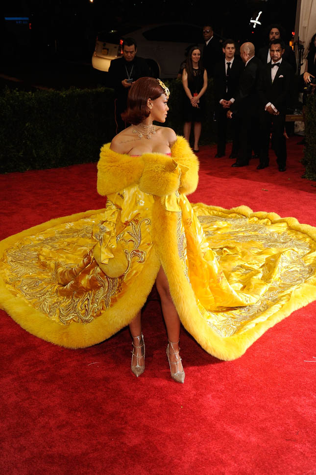 The designer is Guo Pei, known as the top couturier in China, who rose to prominence just as China started producing the most billionaires in the world. They say that in two years, China’s billionaire count will exceed that of the United States (maybe because we all seem to need iProducts). And just 10 years ago? There were only THREE billionaires in China. So you want rich? You don’t know rich until you know China Rich. That’s part of what I write about in my new column for FLARE – click here to read it. China is a major reason why the luxury market is still viable. China is also a major reason for the ridiculous housing market in many major cities. The Chinese are buying everything. They want bigger, they want brighter, they want MORE. And all of that is represented in Rihanna’s dress.