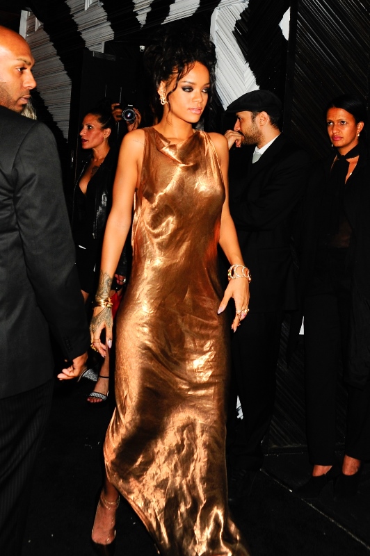 For the after-party, Ri changed into gold and slinky. It’s a dress I could see on Kate Hudson. And while I’m still not moved, I’ll give this one the edge because of the ass crack.