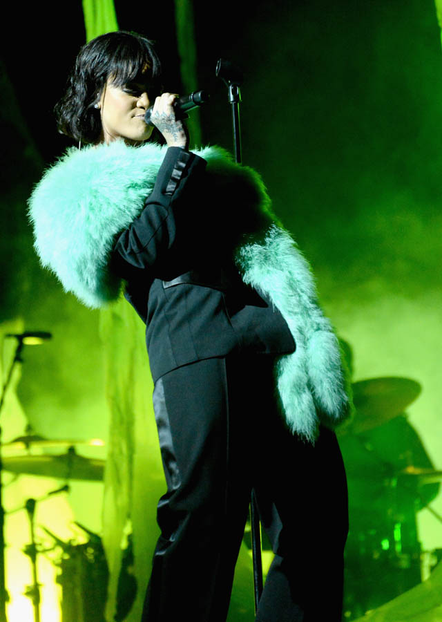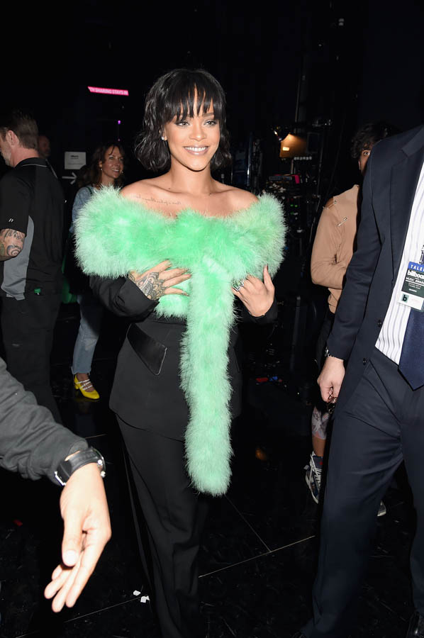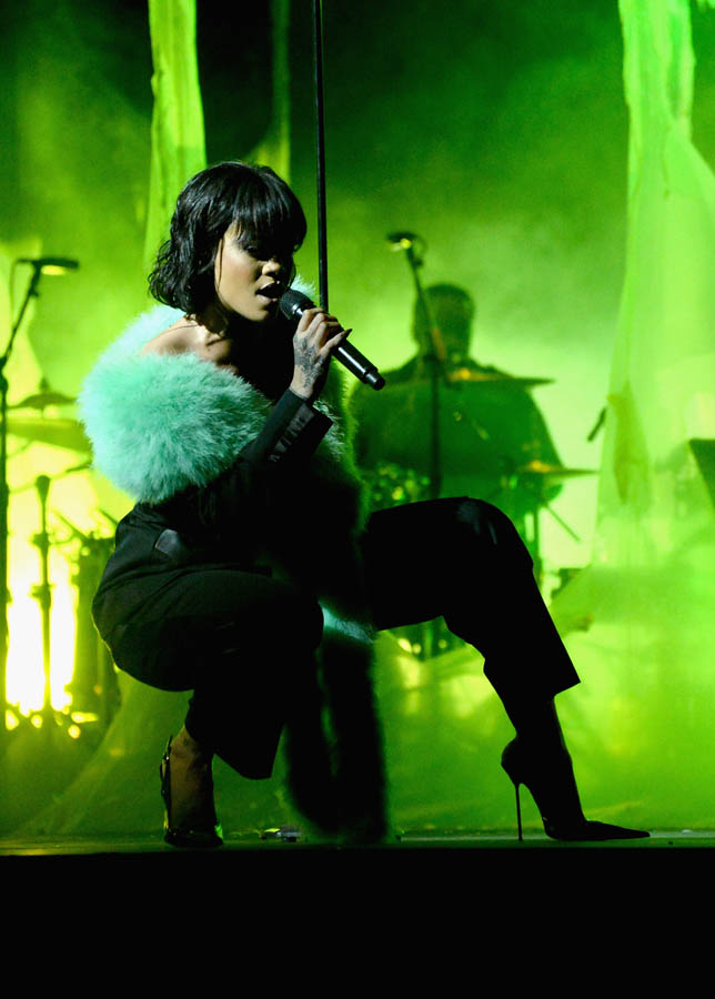 Green seemed to be the theme for Rihanna last night at the Billboard Awards. She arrived in brownish olive green on the red carpet, a vintage jacket dress by Thierry Mugler that felt super 80s and set her apart from all the sequins and bandage straps that everyone else had on. During her performance it was a comic green boa over a black suit. And when she took the stage to accept her award, it was a glitter green beach cover-up, all of it worn with a new banged bob.