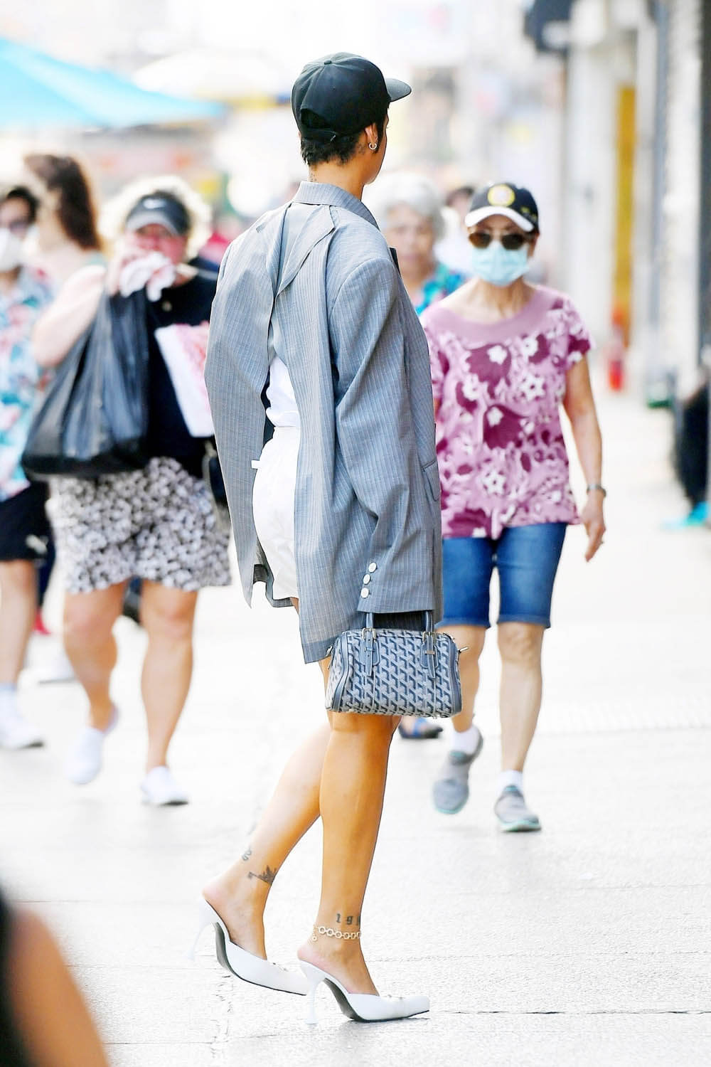 Here’s Rihanna in New York yesterday in a great oversized blazer which has been one of her signature looks over the years. She loves an oversized blazer and this one is split at the back with lapels too. It looks light and I love the hang of it and it’s versatile so you could wear a body-con dress or a bodysuit under but also jeans or shorts, as she’s doing here, and it would still work.