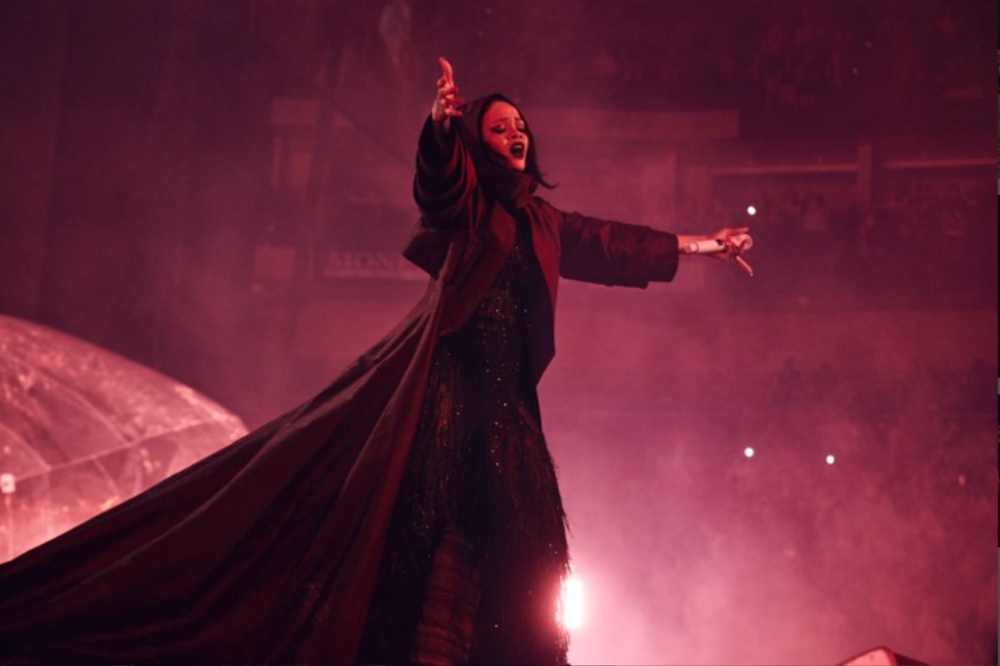It’s a very neutral palette, low on sequins and flash, very much like her FENTY PUMA collection, but the drama… the DRAMA of that cape. And the drama of that dark lip. Who does a dark lip as well as Rihanna?