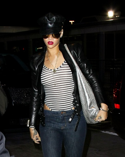 This is Rihanna leaving New York after attending the Vevo launch last night. It’s a bodysuit, see? Ladies should be familiar with the clasps between the legs. On a plane?