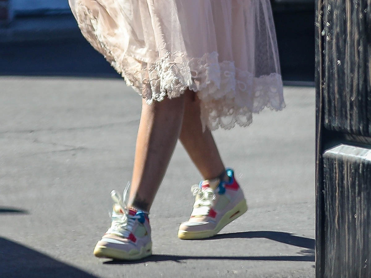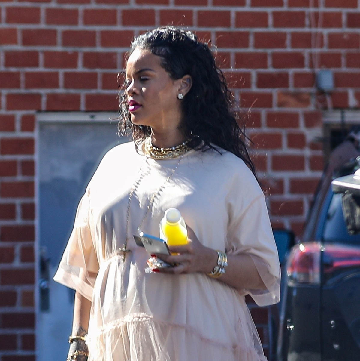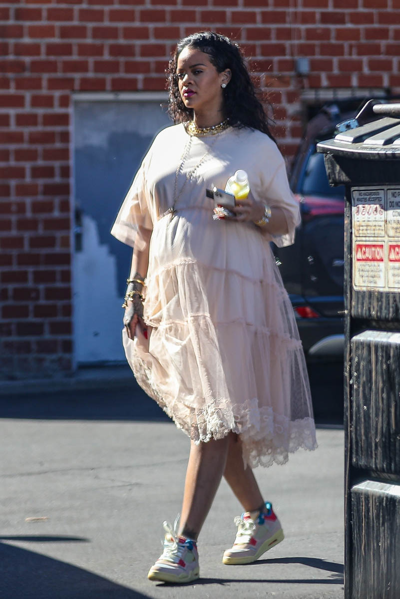 And now we have another outfit to enjoy, perhaps the most “regular person” pregnant outfit Rihanna has worn through her pregnancy: a loose dress with sneakers! OK maybe it’s not that “regular” because that dress looks expensive (it is!) and it’s not like she just threw on something baggy and walked out the door. The accessories are still accounted for and the makeup is on point, so like all the other looks we’ve seen from RiRi, this is a proper look, too.