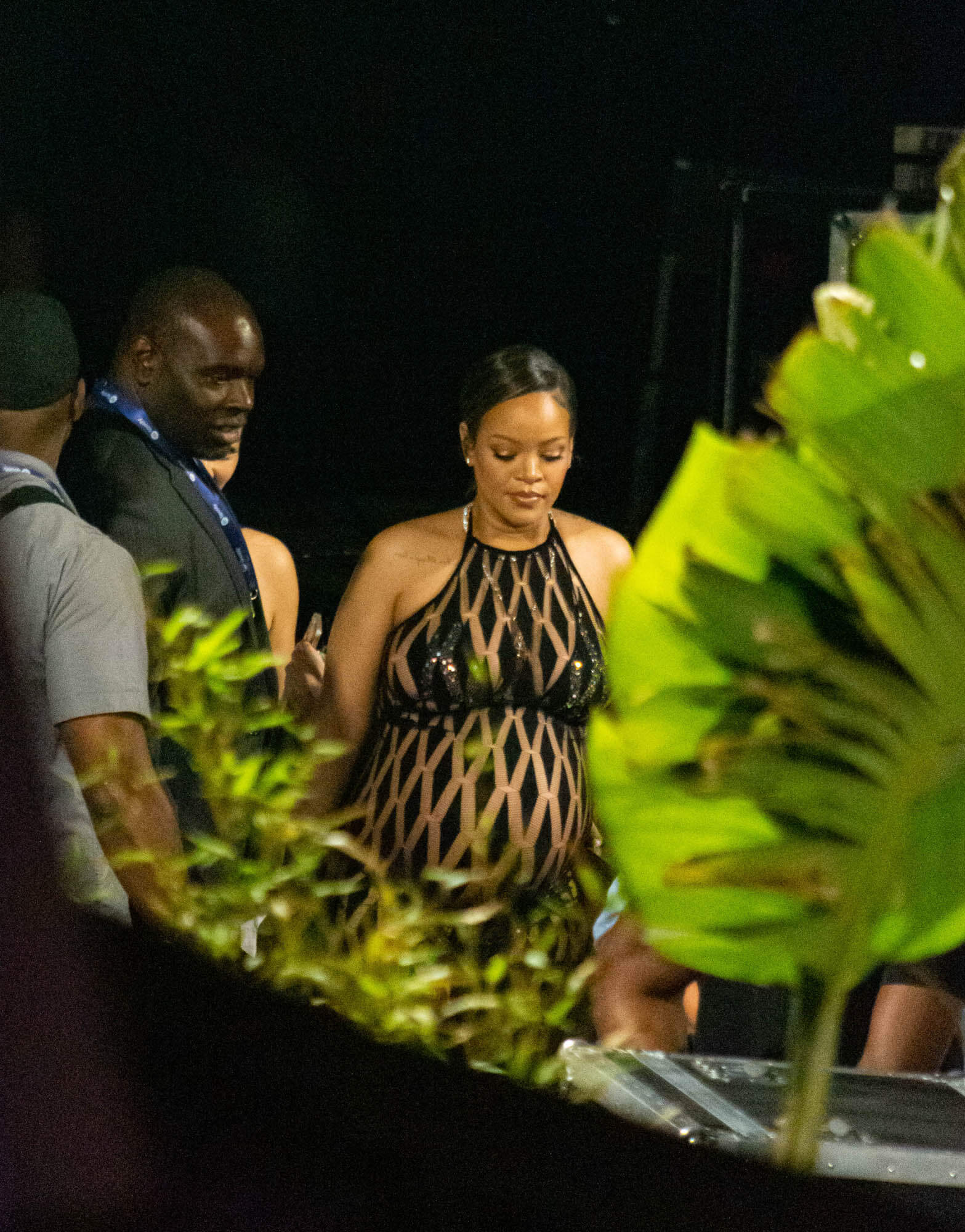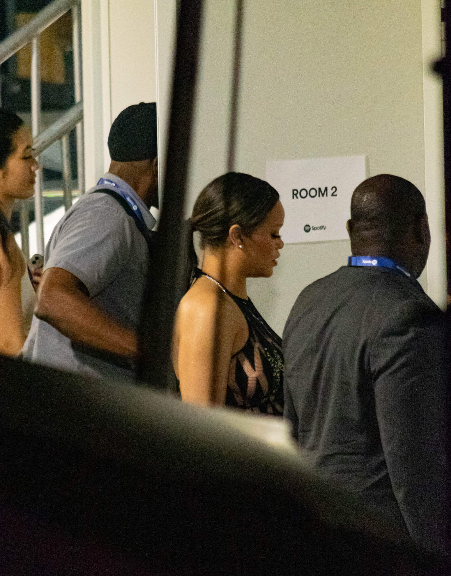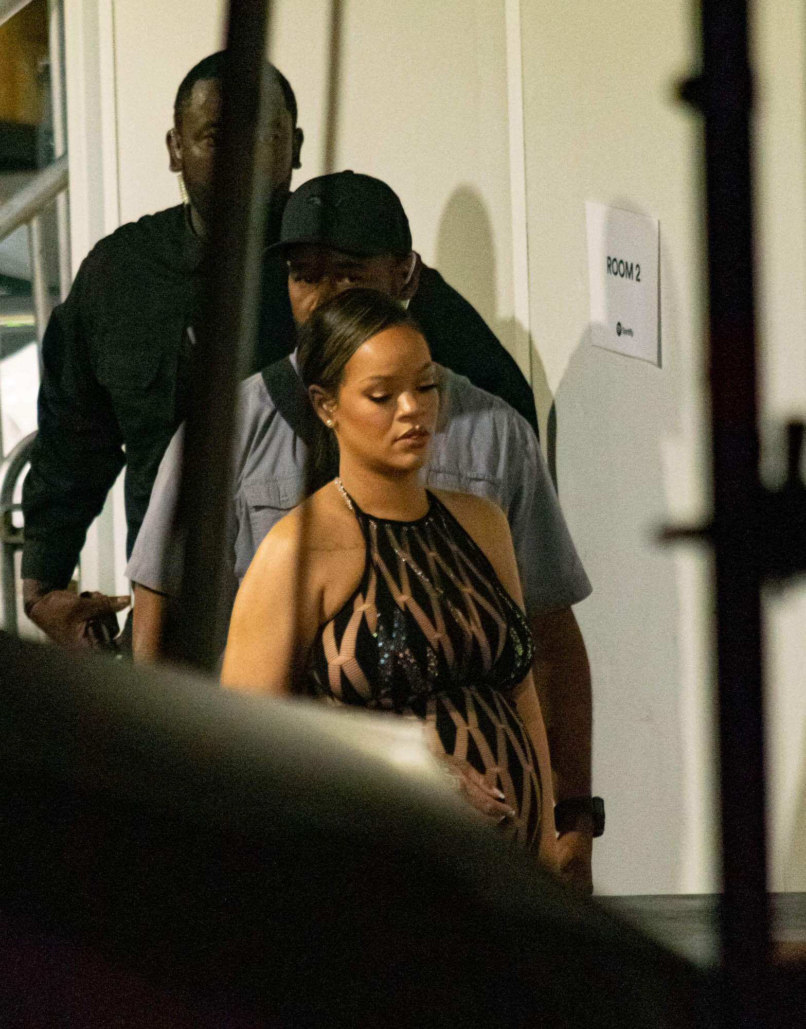 And on that note, about making sh-t work for her, it’s one of my favourite things about Rihanna being pregnant – in that she makes it work for her, her lifestyle, her habits. They don’t change. She’s still out here having dinner at 1am. She’s still at the party. She still staying at the party. Rihanna arrived at the Spotify party last night around 1230am. In heels. And then when she was on her way out, and remember it was already deep into the night, she turned around and went right back onto the dance floor when her own song came on.