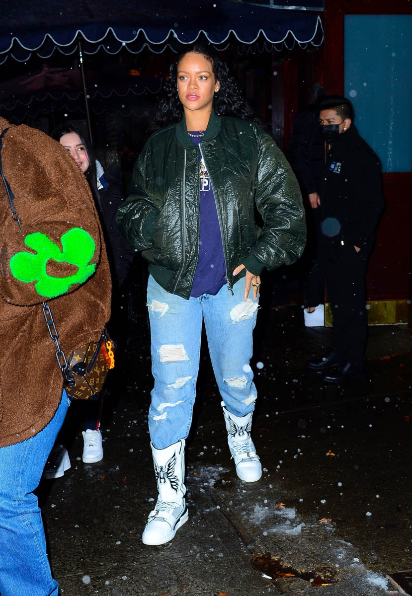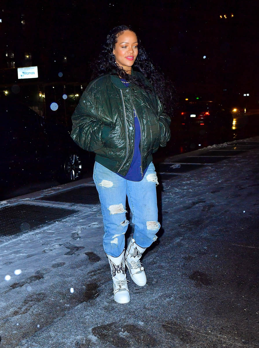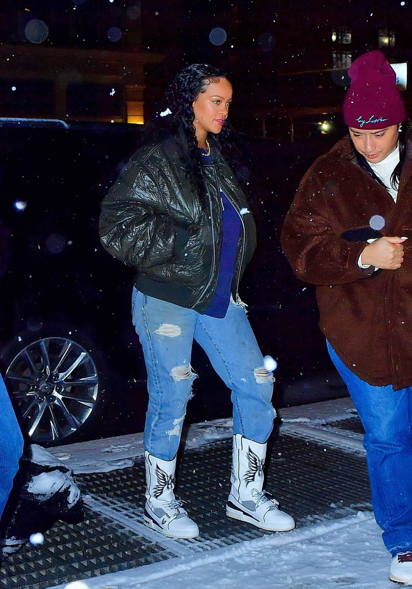 It was snowing in New York last night when Rihanna went out to meet A$AP Rocky for dinner. According to the paps, they went to the studio together afterwards. Whatever they had in NYC though, which was heading to Canada, seems a LOT milder than what we got here in Toronto. It’s a major snow day here and it’s expected to continue until at least this afternoon. There was two feet accumulated in my backyard at 7am this morning. Which I know you don’t give a sh-t about but where I am it’s all we can talk about. People are stuck on the freeway right now.