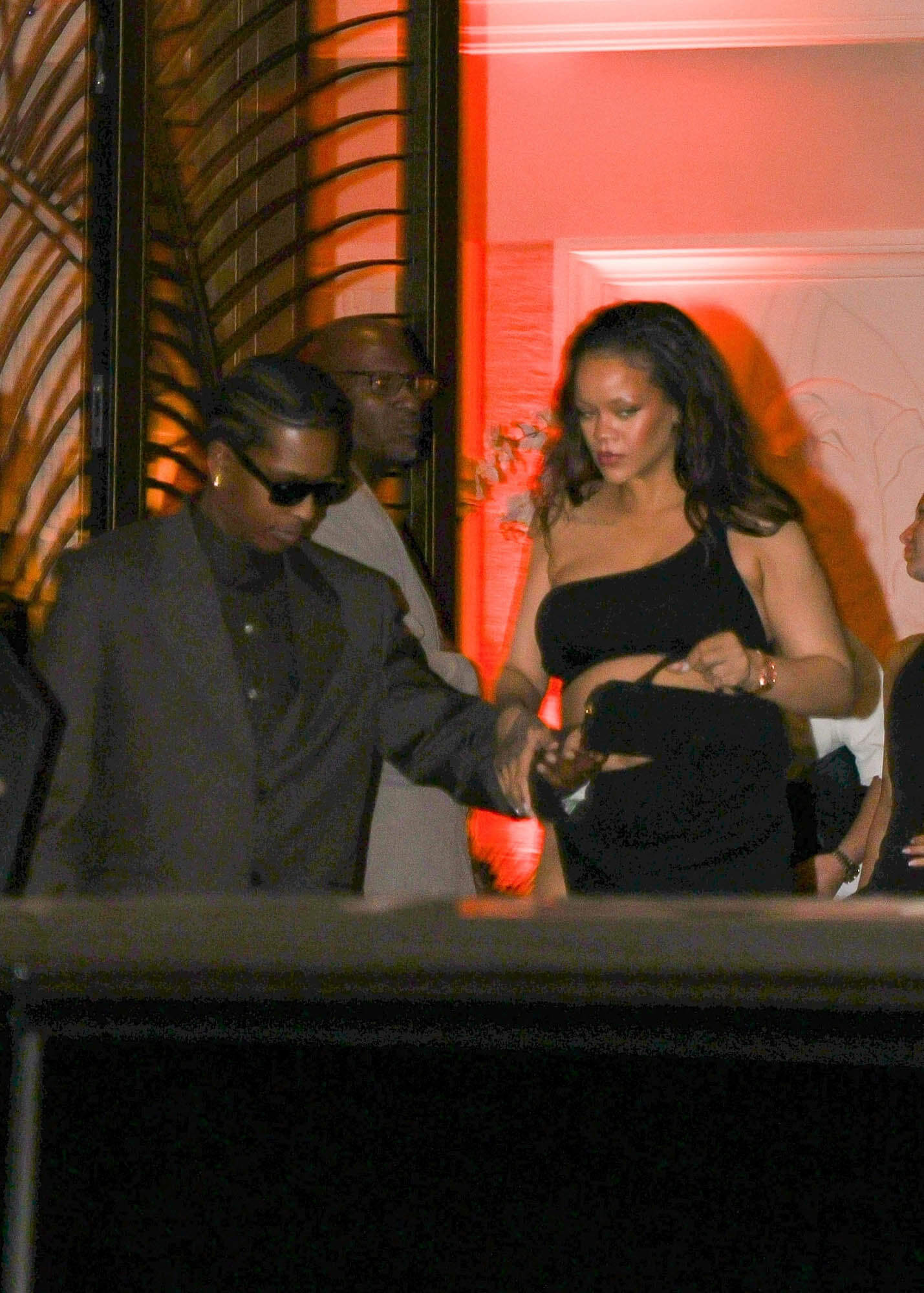 She wore a cut-out dress on the red carpet the other night and she stepped out in an even more revealing fit last night while out to dinner with Rocky. This is a lot of shoulder, a lot of belly, and a lot of leg.