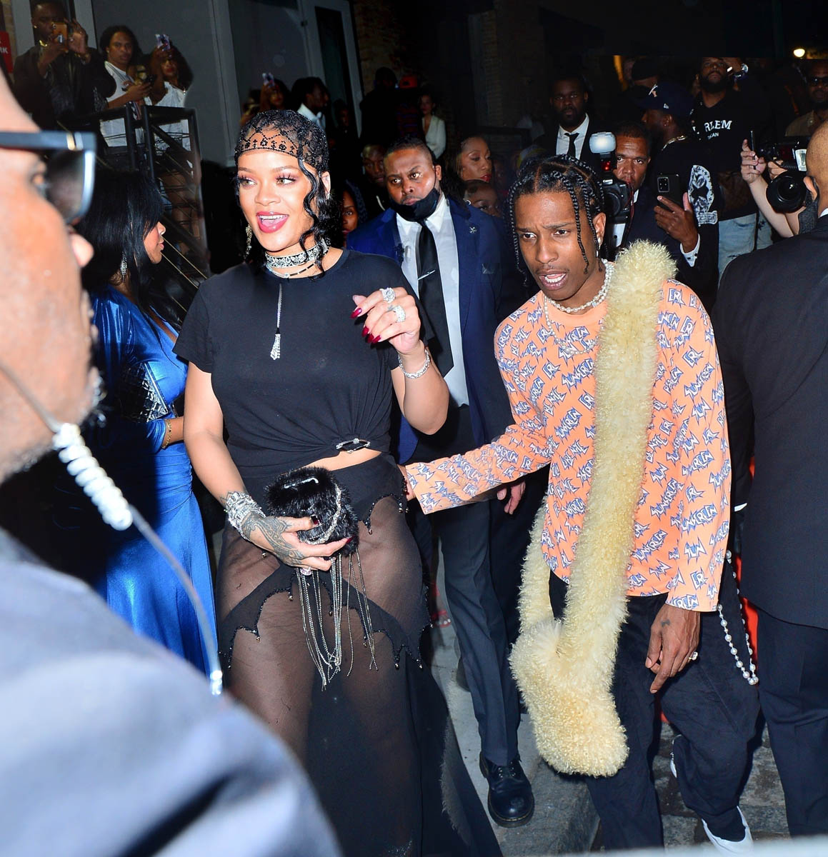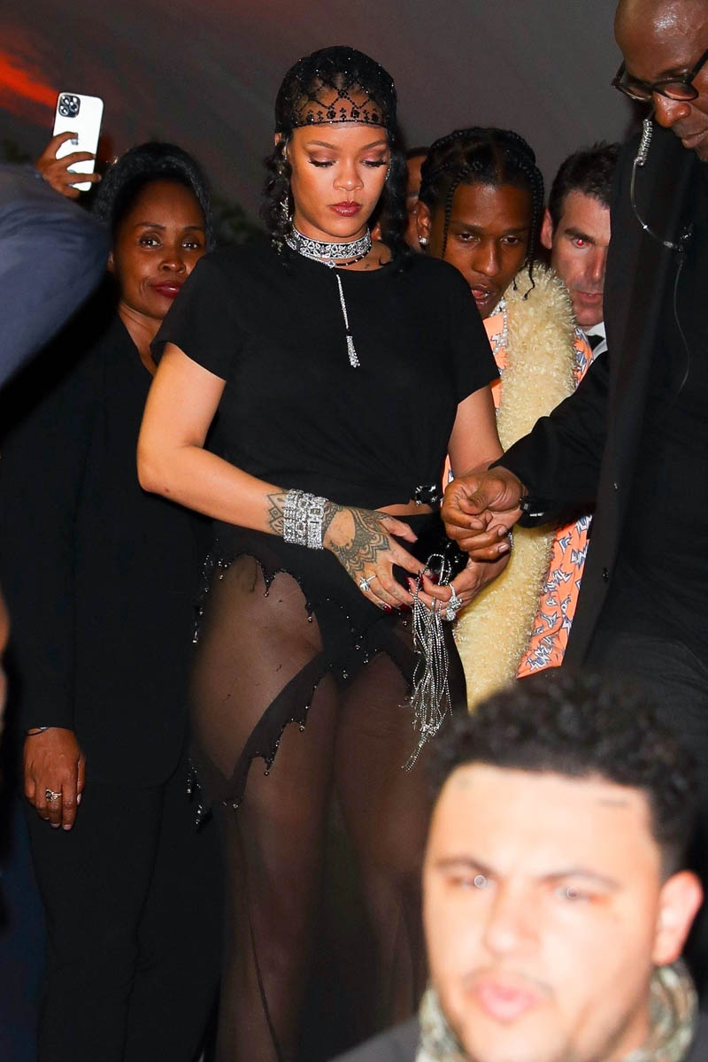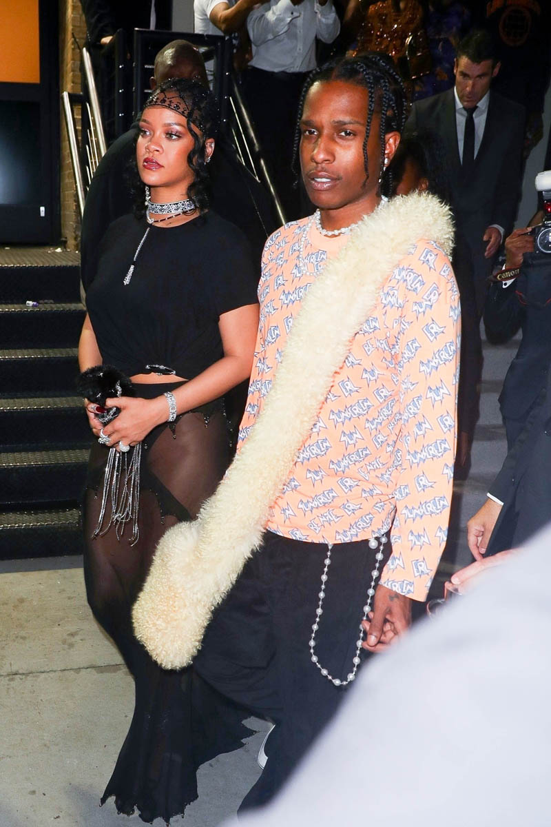 Speaking of Rihanna, if you were wondering what was under her black coat on Met Gala night, I’m attaching to this post some shots of her and A$AP Rocky arriving at her after-party. Not sure if this is what she ended up changing into but it looks like a t-shirt dress featuring a cut-out at the waist and a completely sheer bottom with strategically placed zig-zag panels.