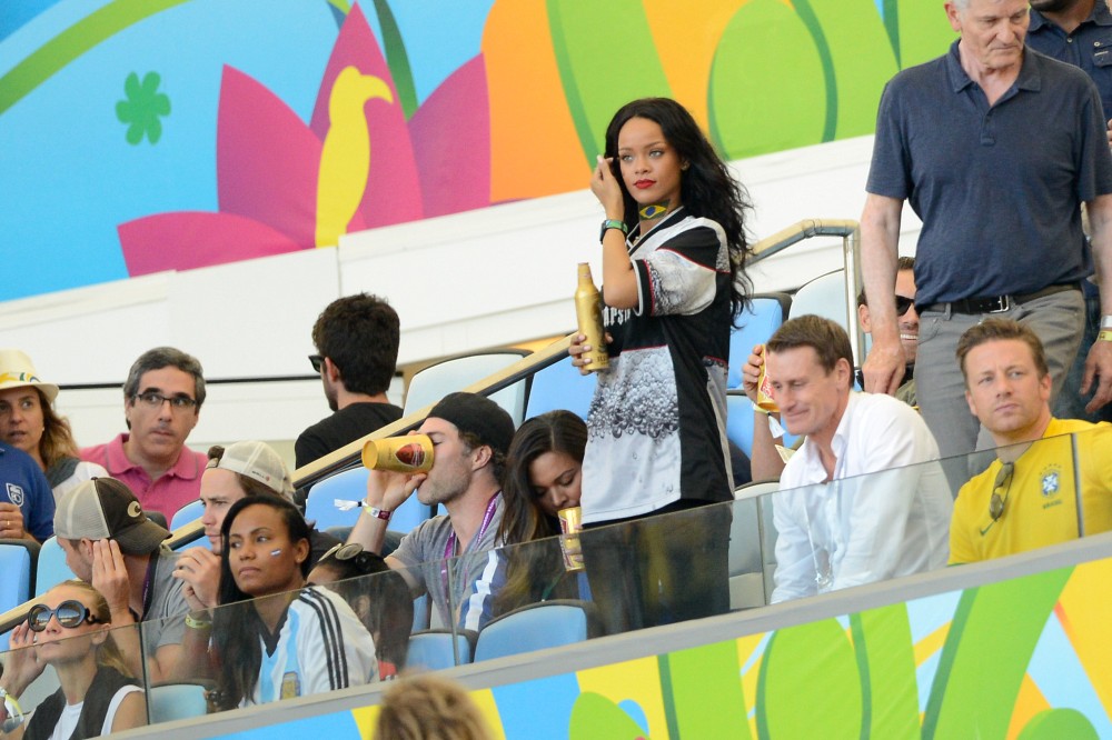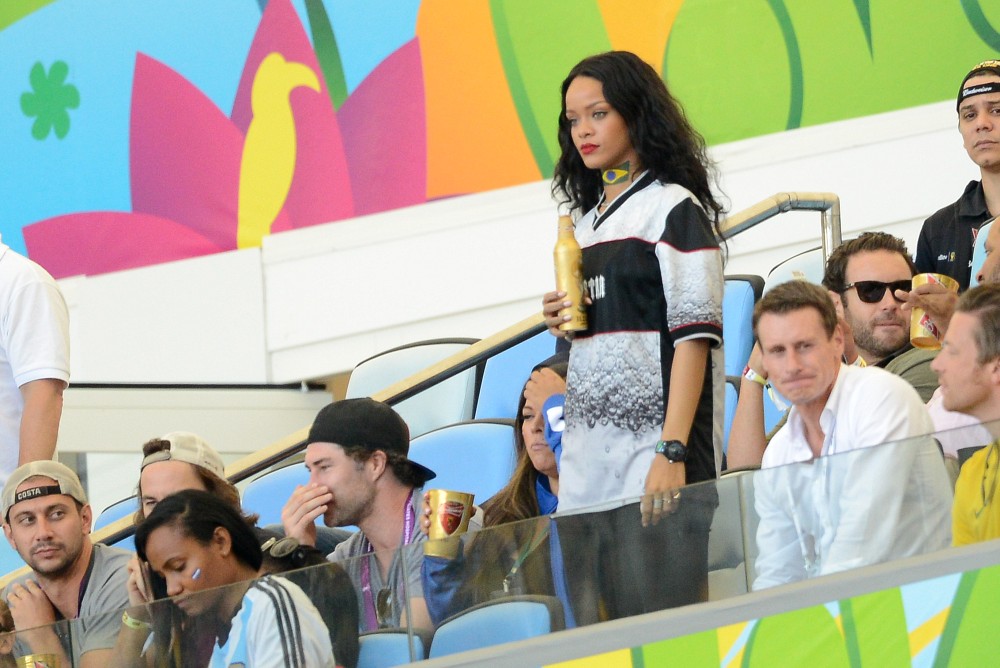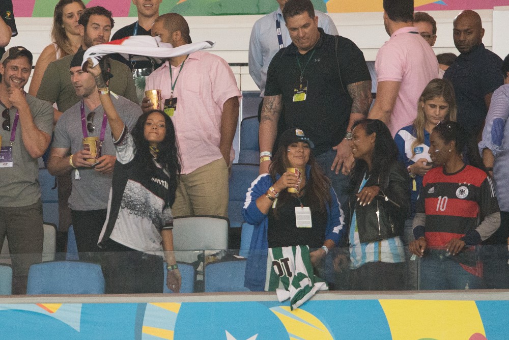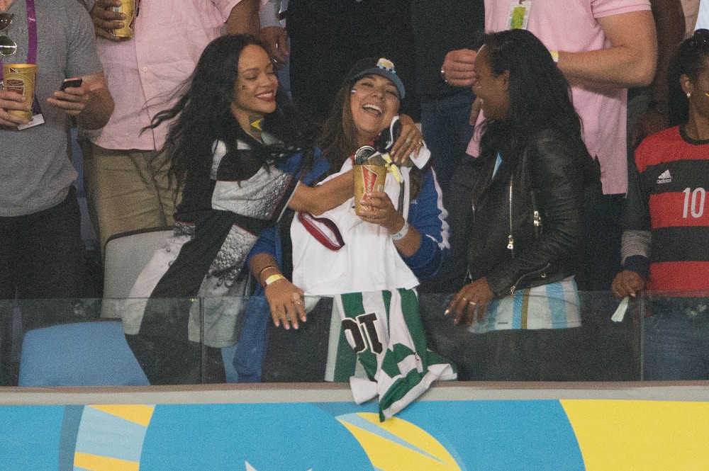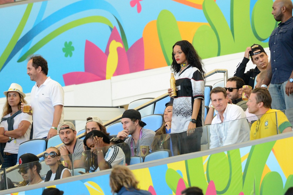 Rihanna was at the game on Sunday. She’s been all over the tournament on her Twitter account. So after Germany’s victory, she partied with the players and the players had the trophy, and she put her hands on it, and now the Daily Mail, because they haven’t sh-t on enough celebrities this week, are calling her out for violating FIFA regulations. Were you offended by it? Some people were… I guess?