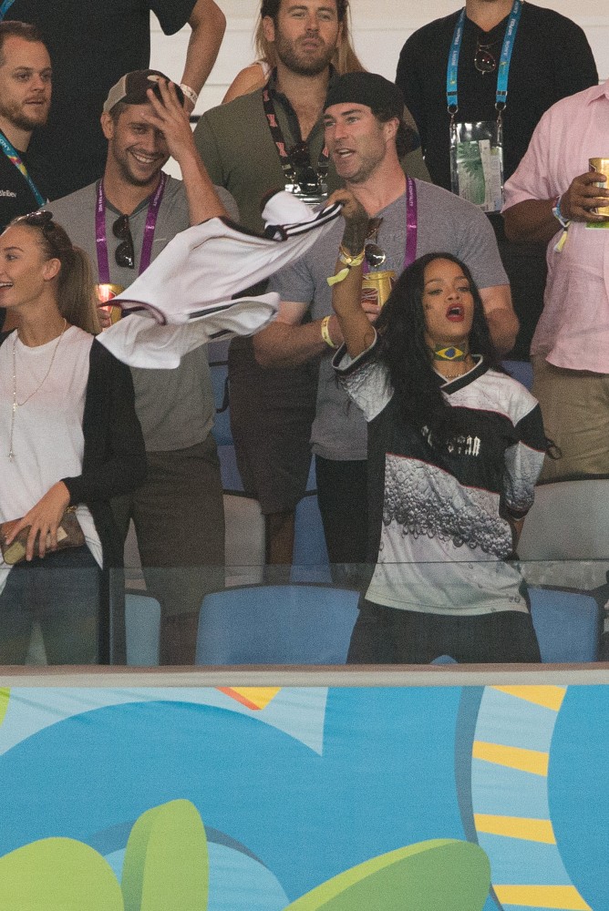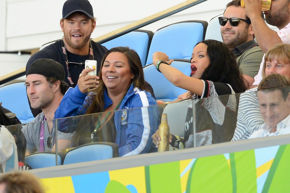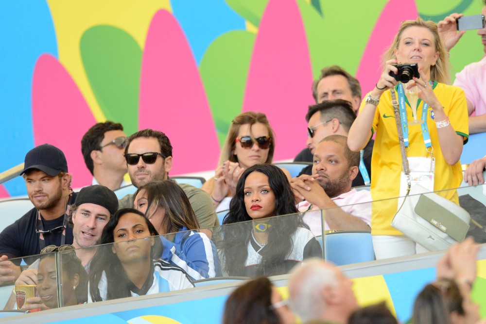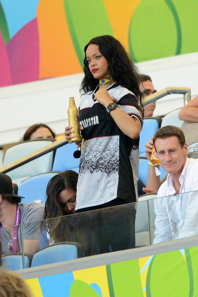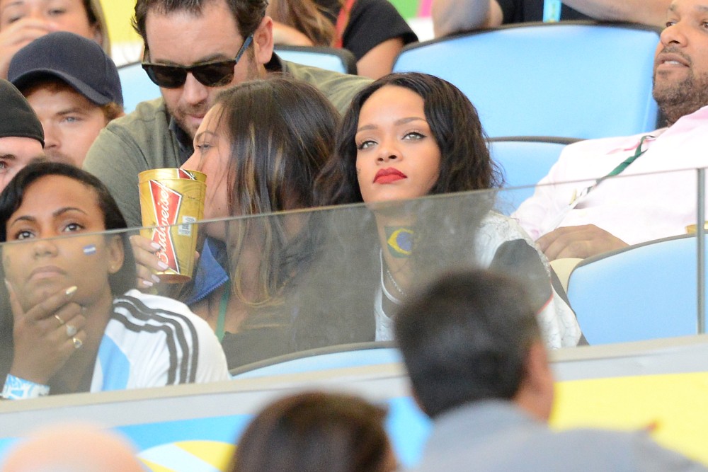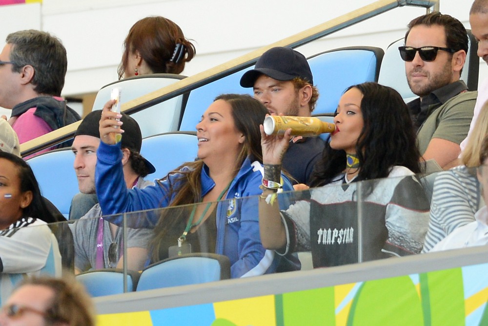 Rihanna was at the game on Sunday. She’s been all over the tournament on her Twitter account. So after Germany’s victory, she partied with the players and the players had the trophy, and she put her hands on it, and now the Daily Mail, because they haven’t sh-t on enough celebrities this week, are calling her out for violating FIFA regulations. Were you offended by it? Some people were… I guess?
