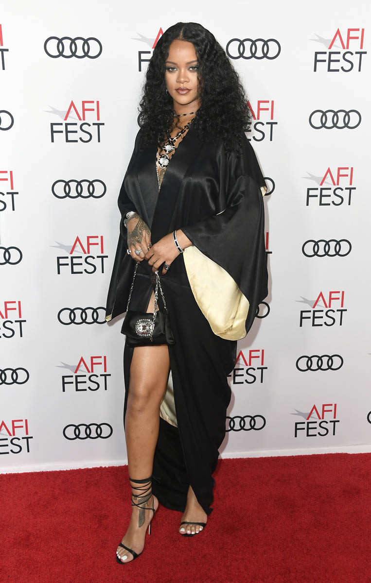 So we start with Rihanna and Zendaya at the Queen & Slim premiere last night. This is a robe-dress on Rihanna and I love it. Because it’s basically sleepwear on a red carpet. Excellent life decision. And excellent design. The button that holds the piece together is perfectly placed high on the thigh. And the sleeves are cut wide and open enough to show you the champagne coloured lining underneath. Also she has amazing legs.