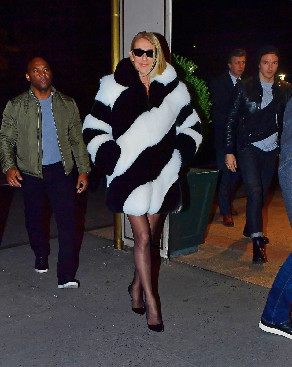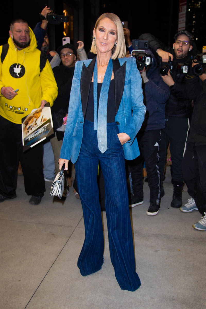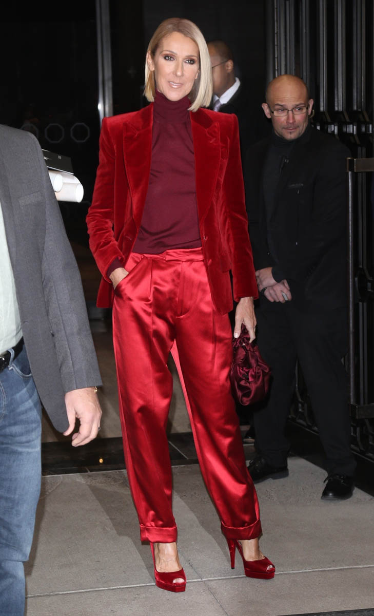 Celine Dion continues to promote her new album, Courage, in New York and stepped out yesterday in multiple outfits. Surprisingly my favourite is the all-red one, velvet blazer on top of silk pants. Red’s not my favourite colour but these pants are so well cut and she’s somehow managed to make this work despite the wrinkling of the fabric and no one cuts a jacket like Tom Ford.