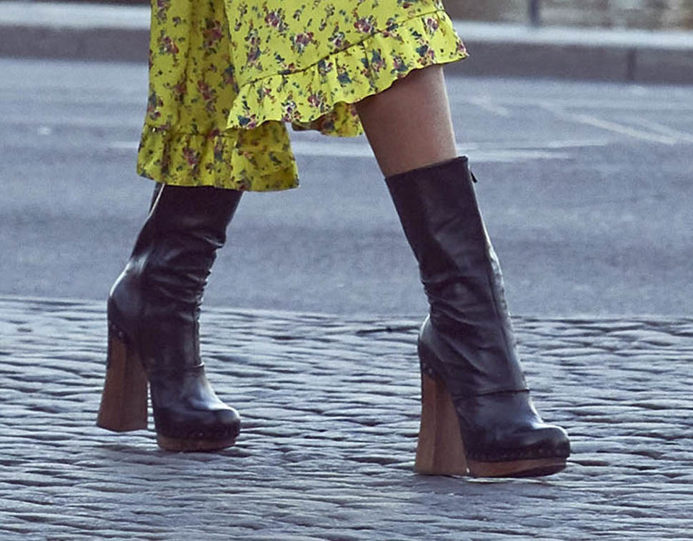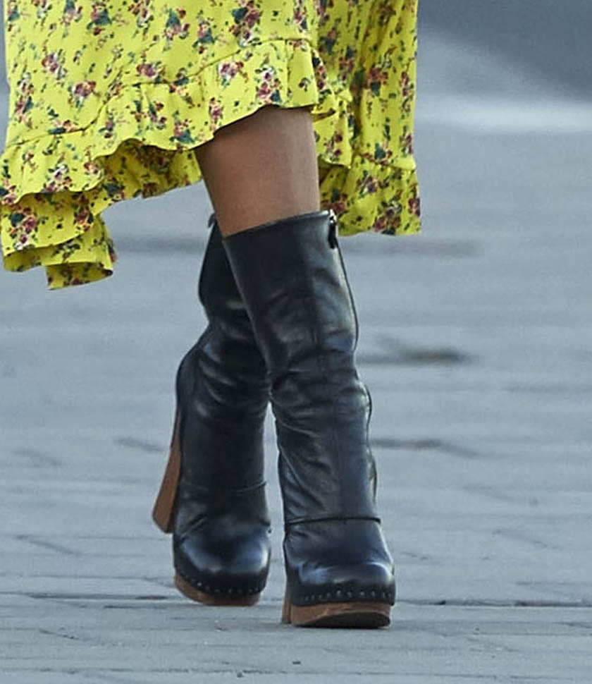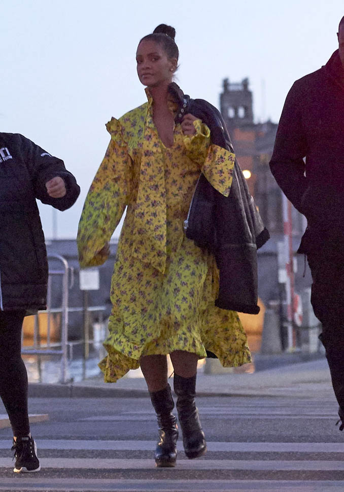 You don’t like the print right? You’re accusing it of being old-fashioned curtains, right? Nope. Not on Rihanna. And not when it’s dressed with these boots. And a clean top-knot is exactly the hair to wear with it.