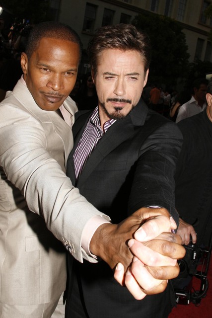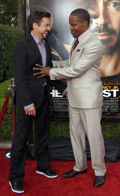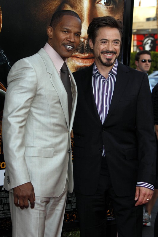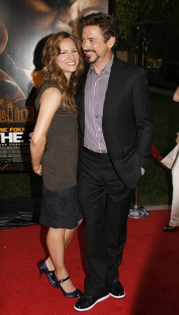 At the premiere of The Soloist last night with co-star Jamie Foxx, not the most popular dude these days. RDJ on the other hand is everybody’s favourite, and he turned up the charm last night with his wife, and Catherine Keener by his side, and Halle Berry showed up too, in flipflops and her body poured into a striped dress with curves and an ass and when I see her I’m always reminded of the time Ewan McGregor was caught mid-interview lasciviously admiring her and he was mildly criticised for it but really, can you blame him?