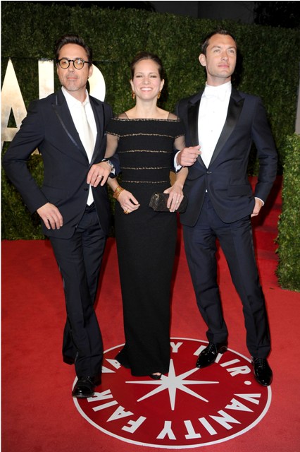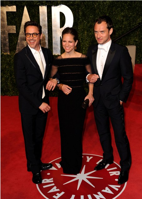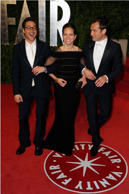 RDJ walked the carpet with his wife Susan. Jude actually skipped the carpet but tagged along with the Downeys to the Vanity Fair party where for a while there he was sandwiched between Gwyneth Paltrow and Cameron Diaz, both former co-stars.