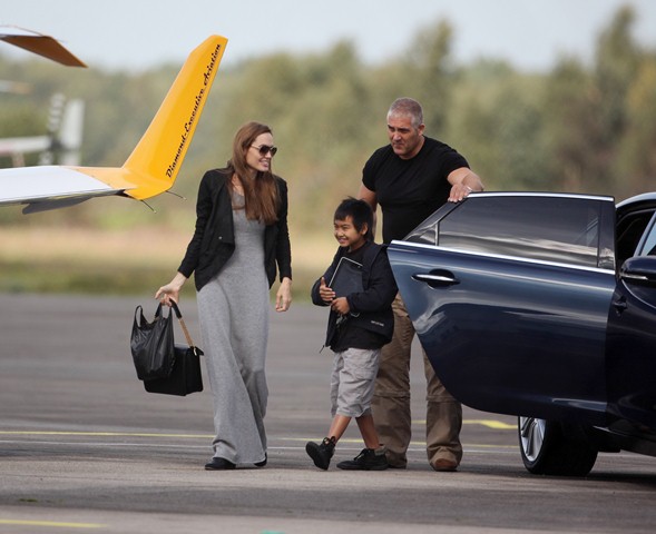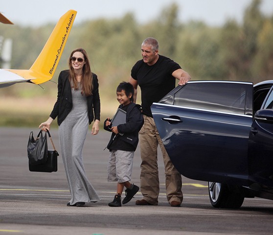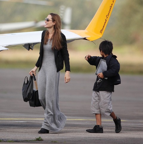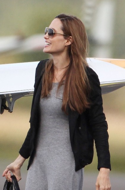 As for the Jolie, she is also in England and was seen with son Maddox in great spirits at a flying lesson. This... is not the kind of outfit I would choose to fly in, but I’m not a pilot. Maybe that’s just more comfortable. But is it practical? If there’s an emergency? Perhaps she just wants to silence the pregnancy rumours. That does look like gorgeous material on the dress though.
