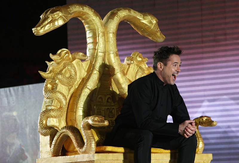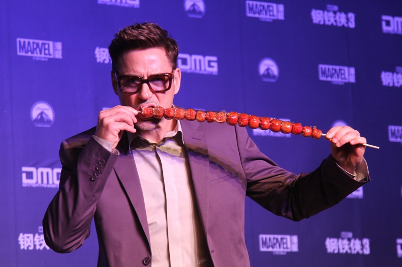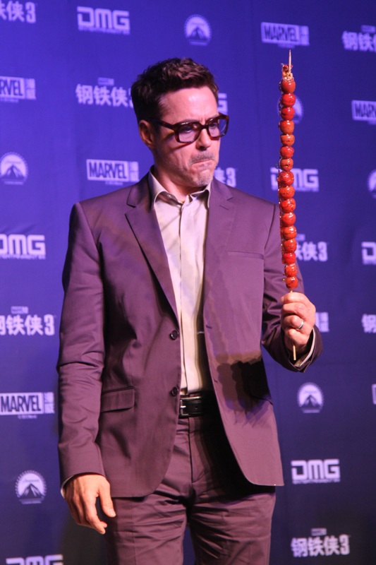 Ben Kingsley’s the Mandarin is apparently the villain in the upcoming, highly anticipated Iron Man 3. And here’s Iron Man wearing a mandarin style jacket while promoting the film in Beijing this weekend at the Ancestral Imperial Temple. It’s apparently the first time a Hollywood movie has been promoted there. And the first time a westerner has been allowed to celebrate his birthday on the throne. These are some amazing pictures, non?