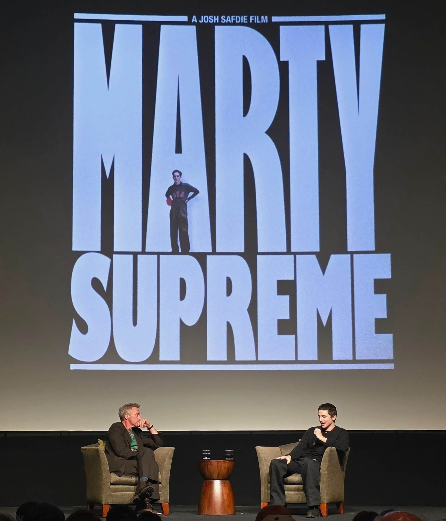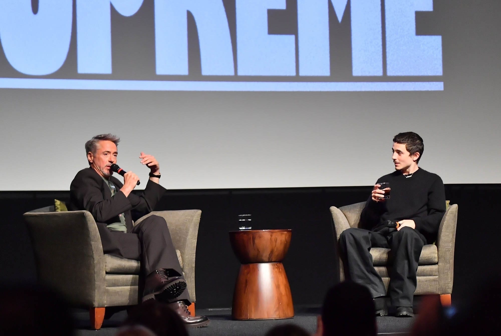 Robert Downy Jr interviews Timothée Chalamet at a Marty Supreme screening Q&A in Hollywood on January 15, 2026