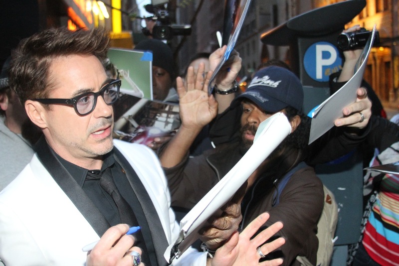 RDJ is spending the week in New York. Last night he surprised teen fans at a special screening of Iron Man 3 who were being rewarded for their part in volunteer efforts after Hurricane Sandy. Video is below and click here to see some of the photos. Look at the excitement on their faces. It’s adorable. Also, he wore a white tuxedo jacket.