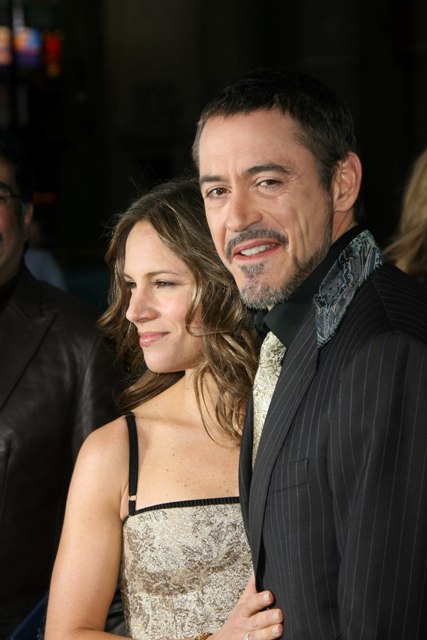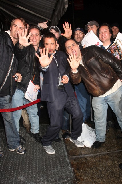 Here he is last night with his wife at the LA premiere of Iron Man trying to save the movie from being ruined at the box office by my girl Gwyneth Paltrow. And a few nights earlier getting goofy with a few fans who were waiting outside the Iron Man afterparty in NYC.