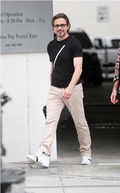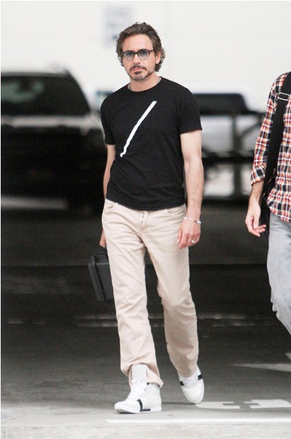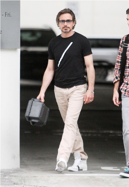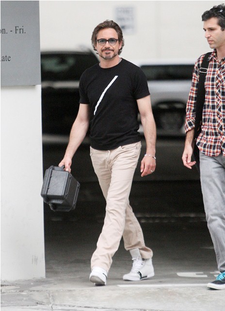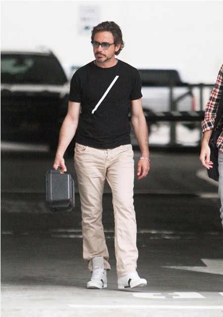 He was with his son Indio earlier this week in Rome but yesterday Robert Downey Jr was photographed back in LA, out and about, with his man purse and his vitamin lunch box, working some longer hair. Looks so great and healthy and relaxed and loose.
