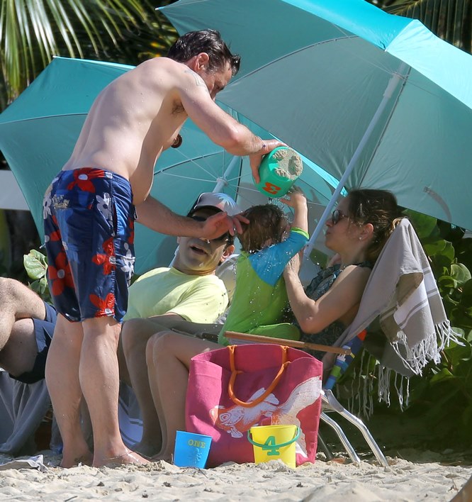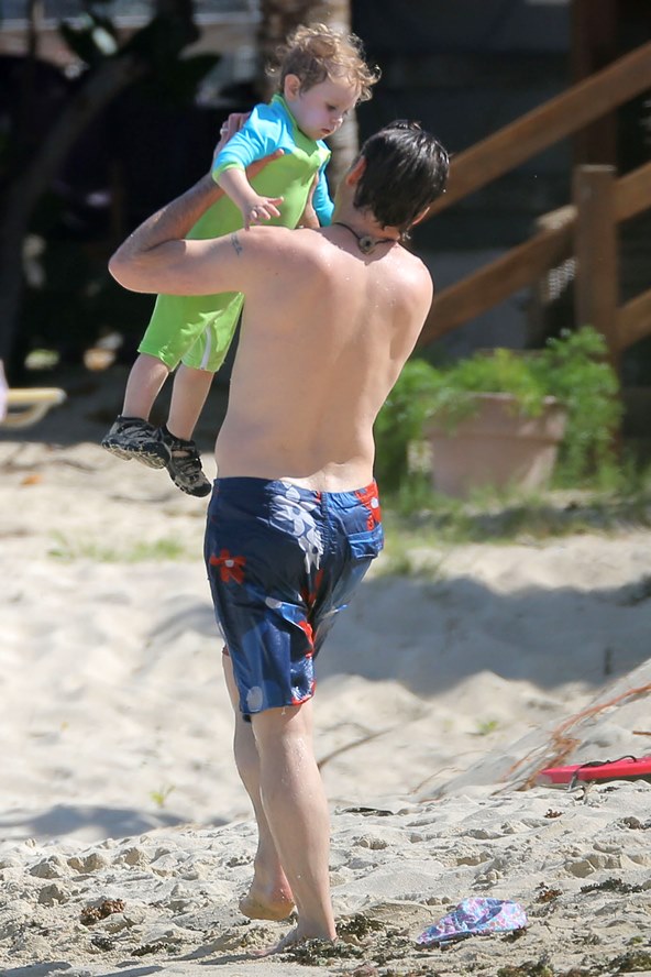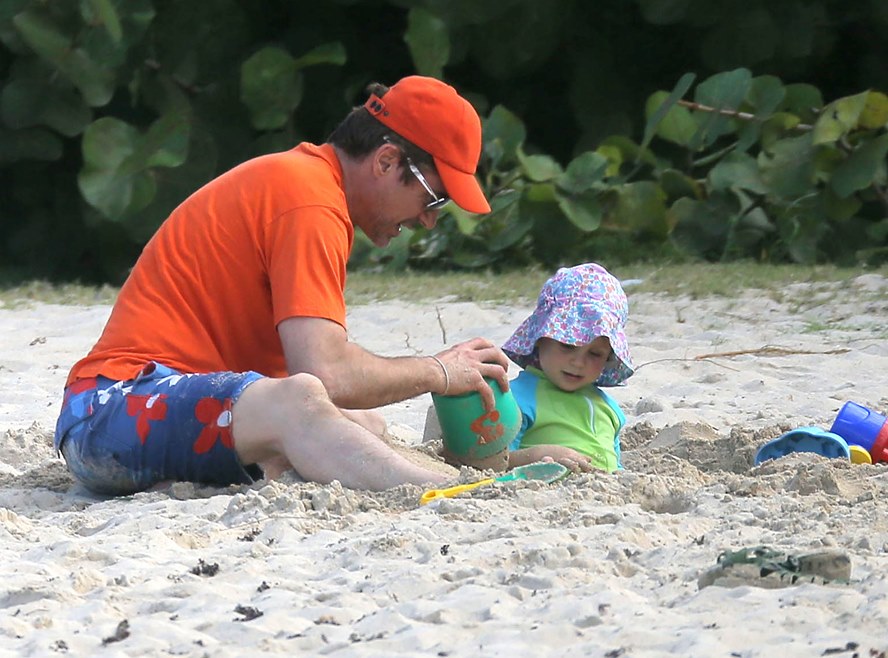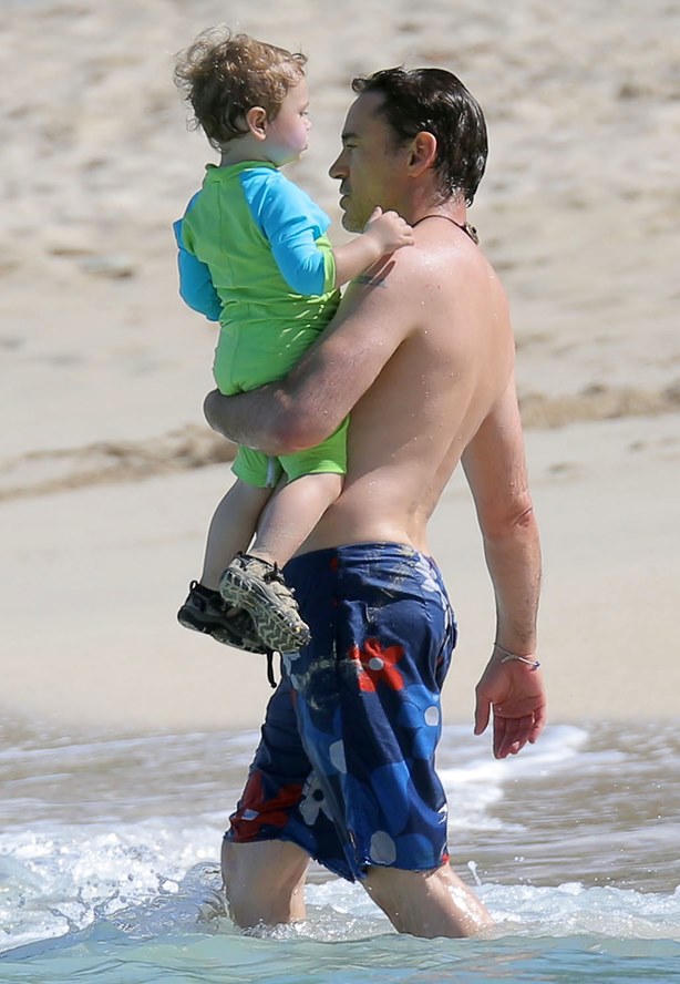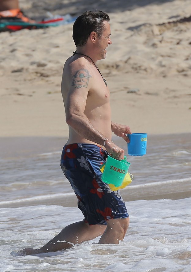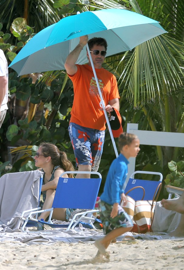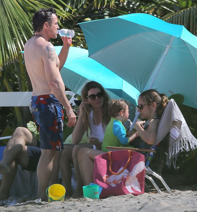 Check out RDJ with wife Susan, their son Exton, and some friends enjoying the beach on Sunday.