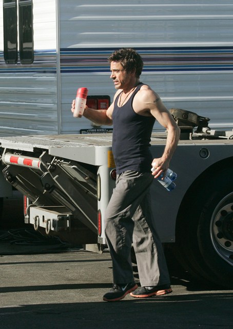 This Monday is full of gifts. First Jim Sturgess, now Robert Downey Jr. Here he is on the set of Due Date and also prepping for a fight sequence with his trainer. Due Date is Todd Phillips’s next film, a comedy, about a man trying to get home to his wife, who is in labour, and he’s forced to endure a road trip with Zach Galifianikis. Philips and Galifianikis last worked on The Hangover. RDJ + Phillips + Galifianikis? High hopes for comedy gold.