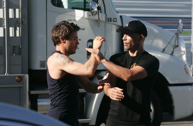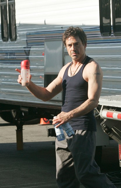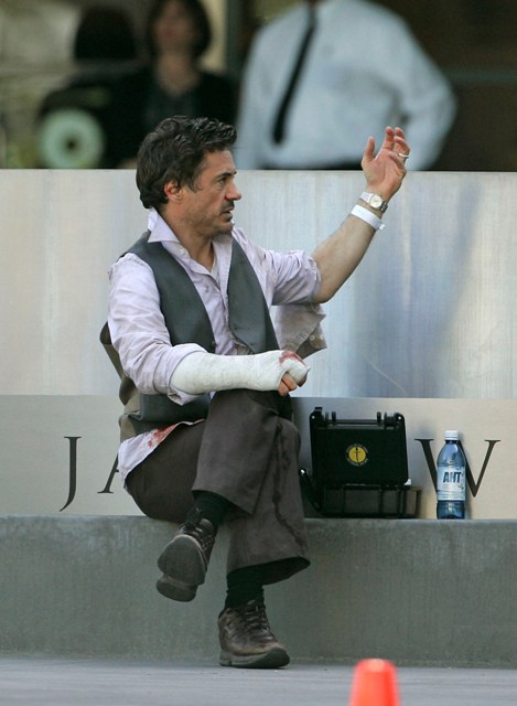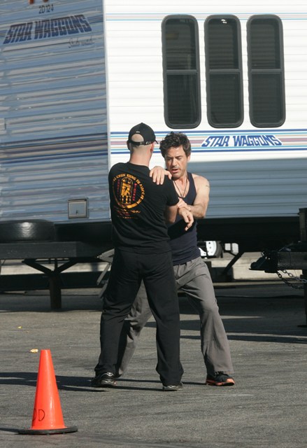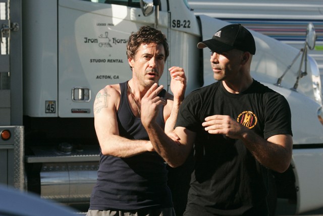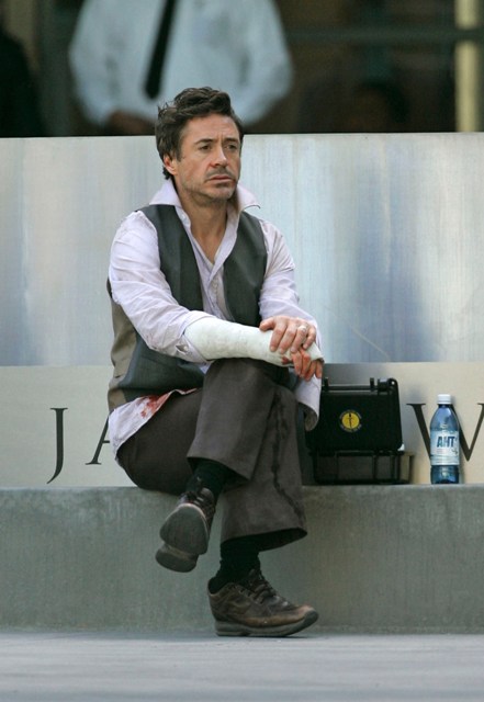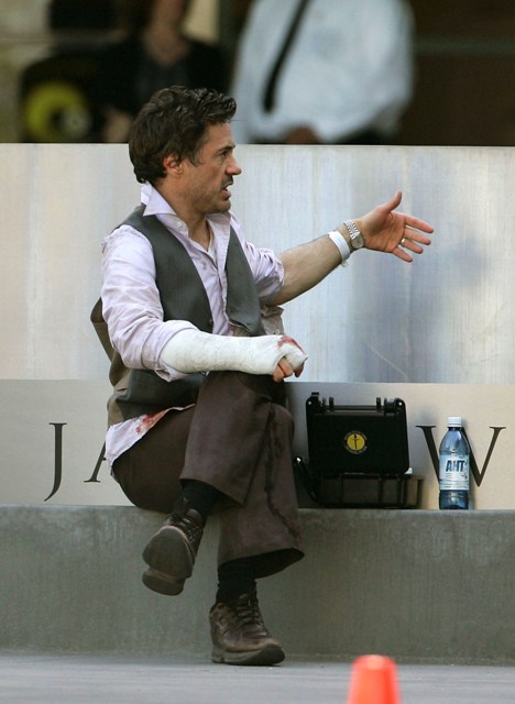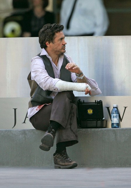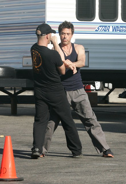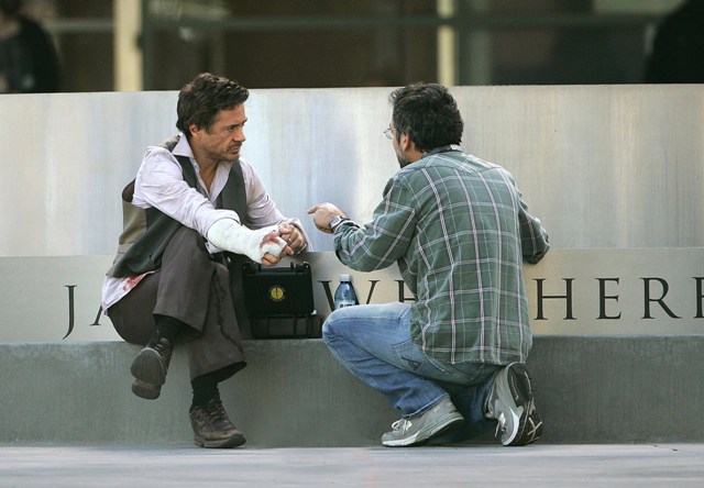 This Monday is full of gifts. First Jim Sturgess, now Robert Downey Jr. Here he is on the set of Due Date and also prepping for a fight sequence with his trainer. Due Date is Todd Phillips’s next film, a comedy, about a man trying to get home to his wife, who is in labour, and he’s forced to endure a road trip with Zach Galifianikis. Philips and Galifianikis last worked on The Hangover. RDJ + Phillips + Galifianikis? High hopes for comedy gold.