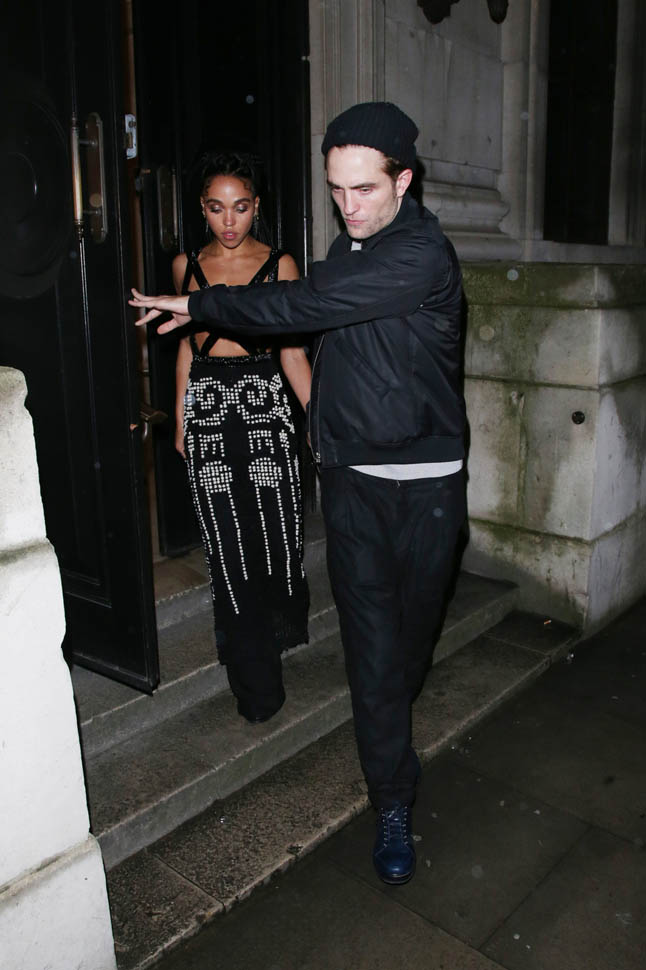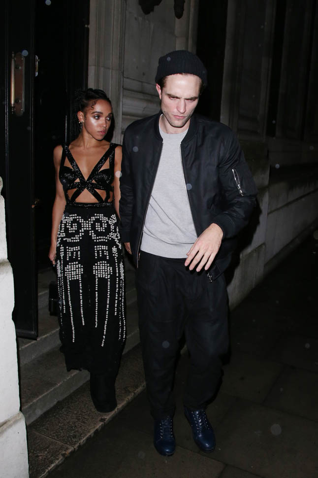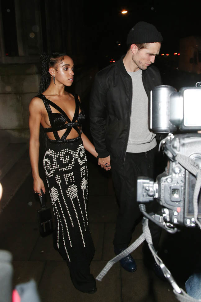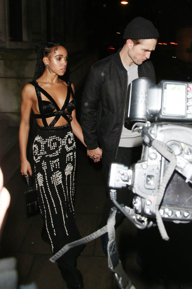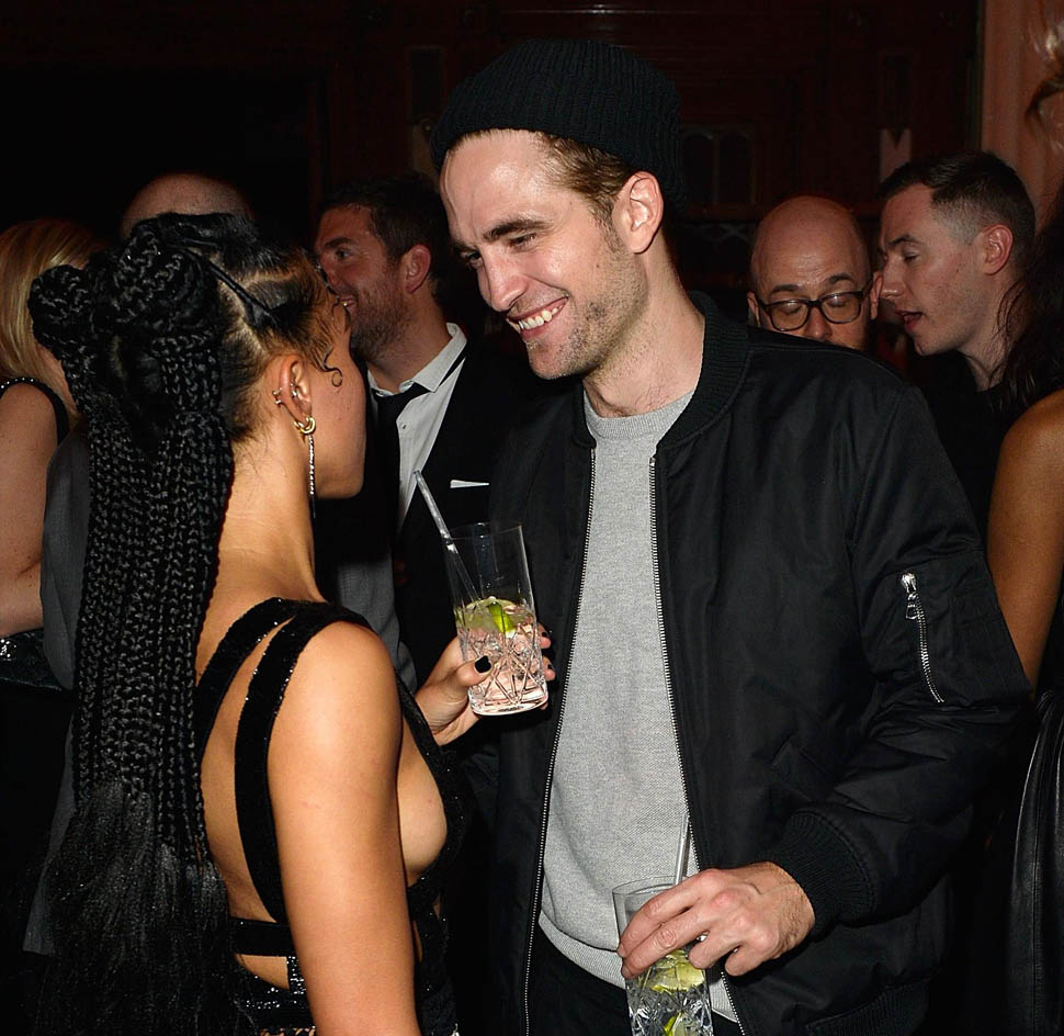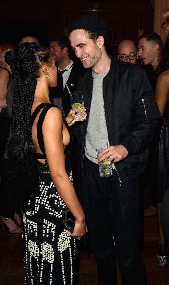 Check out this shot taken inside the Warner Music party after the BRITs last night. The photographer was allowed to shoot at a good distance. And no one is jumping into a trash bin, even though it’s FKA twigs and boyfriend Robert Pattinson. They’re together. They know that you know they’re together. And I like that they’re not trying to be super precious about it. I mean, Chris Martin would be halfway down the block by now.