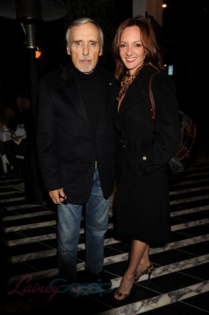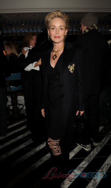 Sharon Stone was holding court in there. Say what you will about that crazy bitch…Sharon is keeping together NICE. I could hear her from time to time, laughing as she does in that queenly way, her voice carrying over the din of the dining room. And Sharon doesn’t walk. She sweeps. She swept out of there at the end of the night air kissing people left right and centre…including Dennis Hopper. Those two seem to be pretty fond of each other. At the AMFAR event in Cannes last May he mentioned how she calls to harass him to do sh-t for her all the time. Last night when he arrived, he made a point of going over to greet her. Hollywood friendships always surprise me.