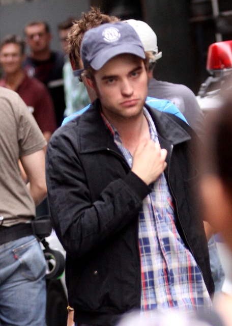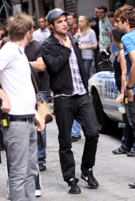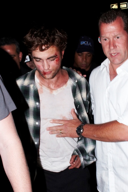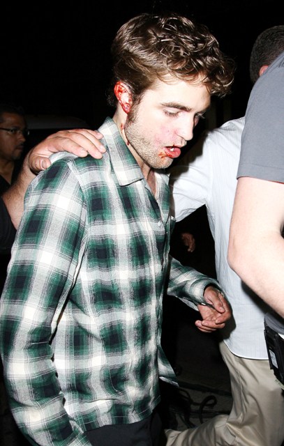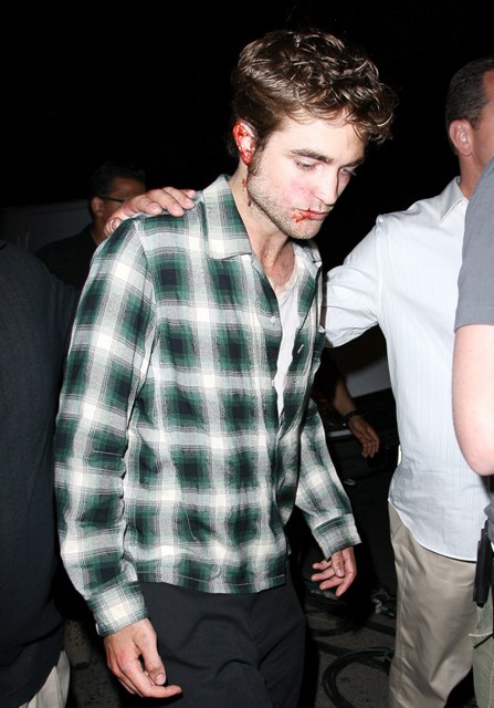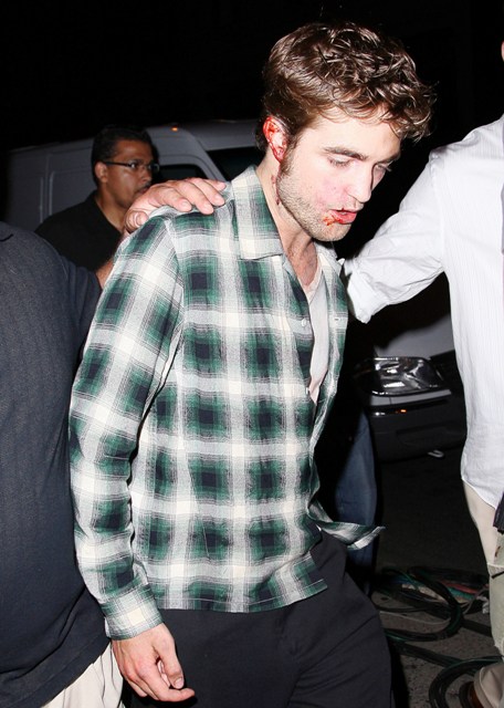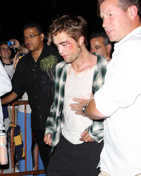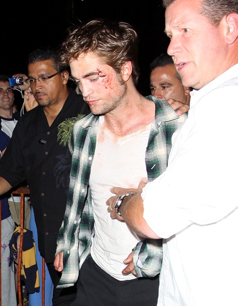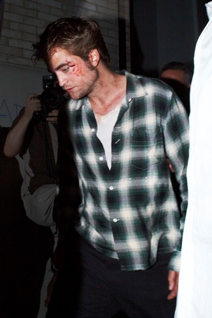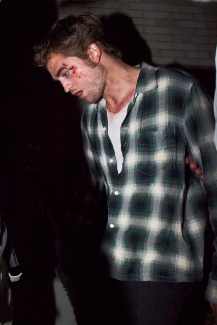 Because Robert Pattinson has a bruised and bloody face. It’s obviously makeup for a scene in Remember Me shooting in New York last night. But we all now know the Twi-hard inability to separate fact from fiction. The same way they truly believe Pattinson is Edward Cullen and should therefore be dating Bella/Kristen Stewart, which means they are probably heartbroken this morning at the site of these photos of their beloved looking like he’s been attacked by one of them.