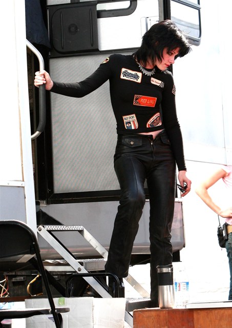 On the subject of Kristen’s hair then, here she is as Joan Jett yesterday in leather pants with one button undone and red lipstick. Works for me.