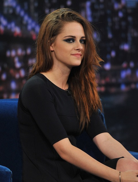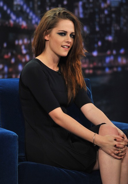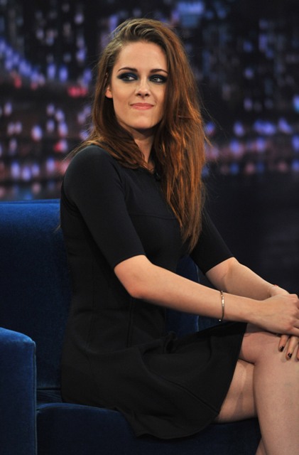 While Pattinson’s masked outlaw channels Rodin, his girlfriend Kristen Stewart appeared on Jimmy Fallon last night after a full day of media that also included The Today Show and Live! With Kelly. She must get better as it gets darker because by the time she got to Late Night, she looked amazing.
