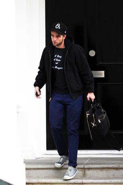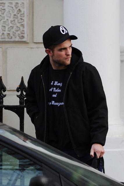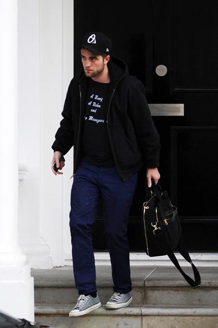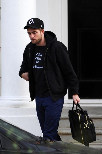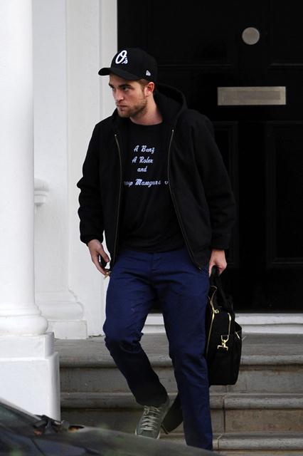 Maybe every post today on the main page is going to be about pants and how men wear them. Here’s Robert Pattinson leaving his place in London this morning wearing really bad ones. Like gross. The colour is sh-t, the fit is sh-t, they’re weird around the crotch, they’re not falling right around the ankle...and I just saw the new Twilight movie the other night and thought he looked (mostly) great the whole time.