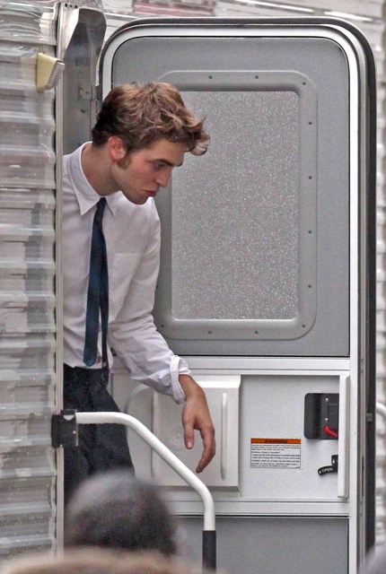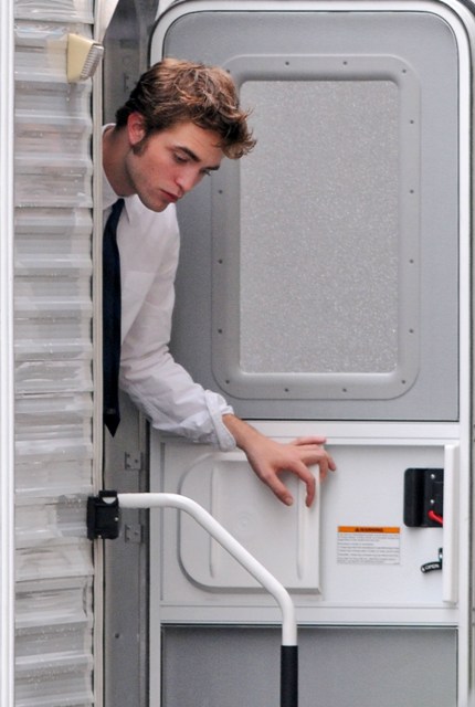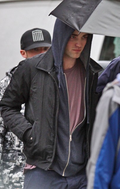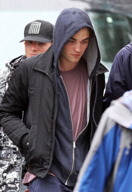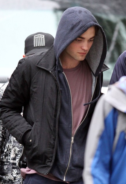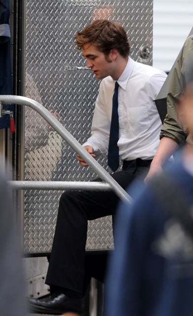 This is Robert Pattinson on set yesterday. Summit is insisting that he’s fine and that the incident was not caused by fans – well of course they would say that. Summit is nothing without the fans. And given that Twilight is such an online driven franchise, with Twi-hards spending most of the day scouring the internets for new photos and information, populating message boards with their fantasies, it’s only in Summit’s best interest not to alienate the lunatics, in the hopes that they will once again present themselves at theatres for New Moon seven, eight, nine times and video themselves crying on YouTube afterwards.