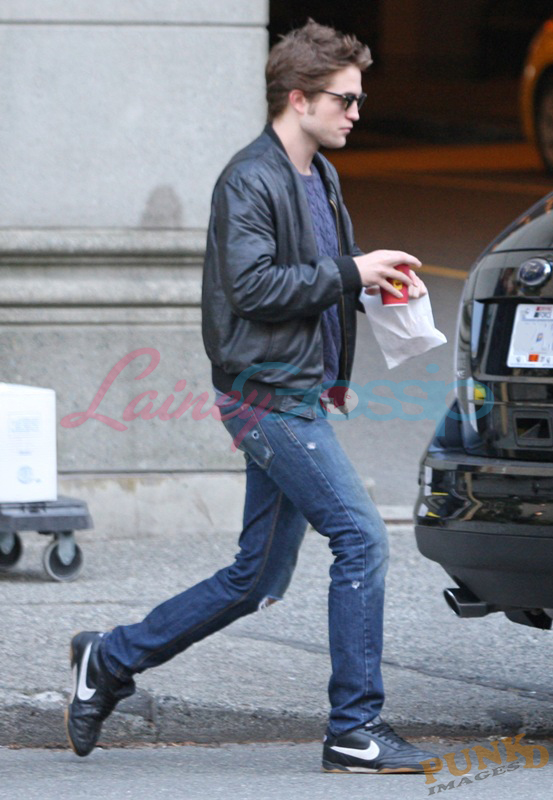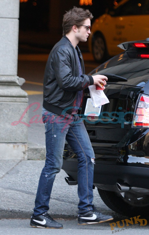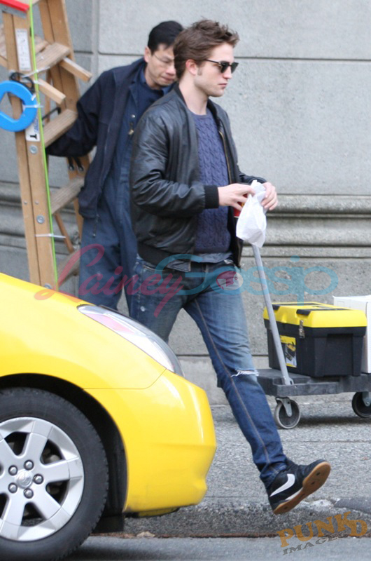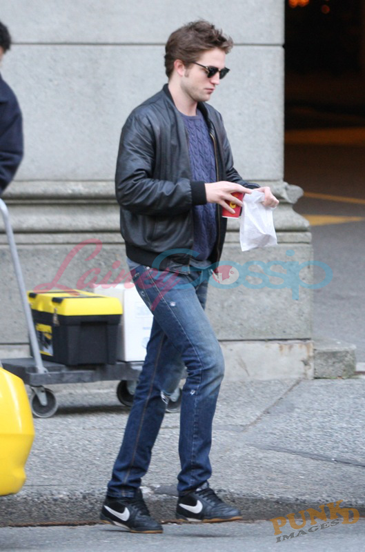 Groggy Robert Pattinson this morning in Vancouver, stopping for coffee and a snack on his way to work wearing grandma’s sweater. Like the Devil Wears Prada Sweater, you know the one? Miranda Priestly called it “cerulean”. Rob’s isn’t quite as bright but the idea’s there. Not something Zac Efron would ever put on and, well, I guess that’s the point. Same goes for the dirty jeans.