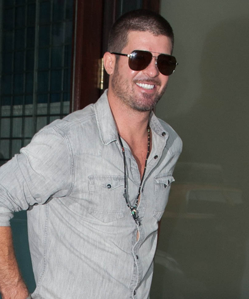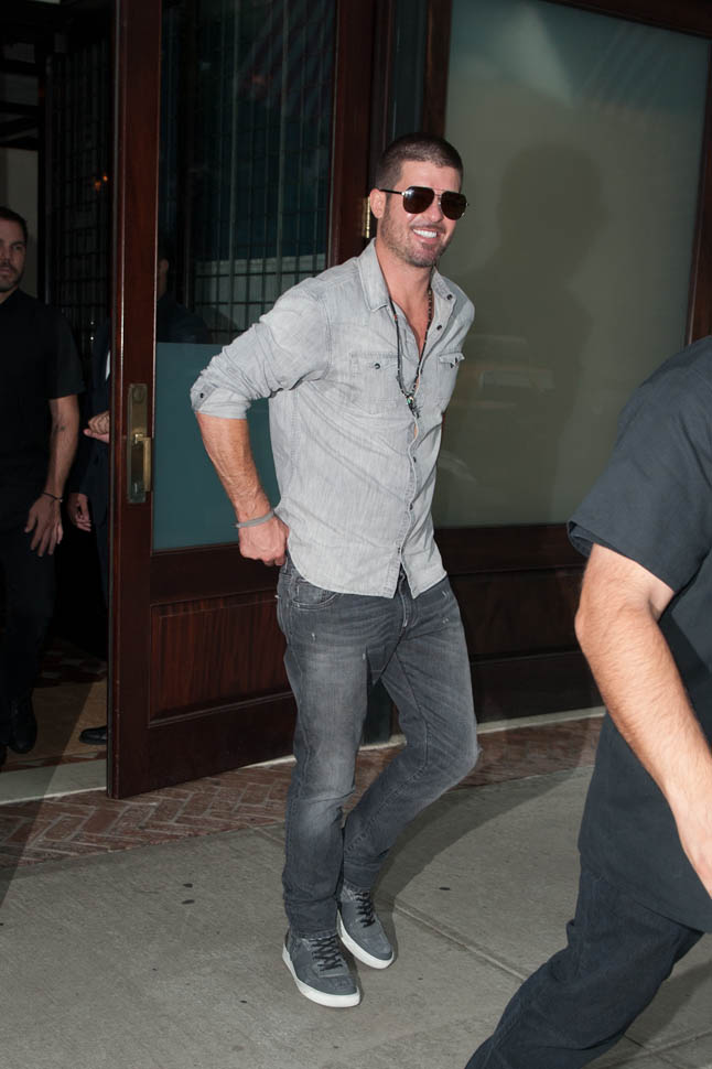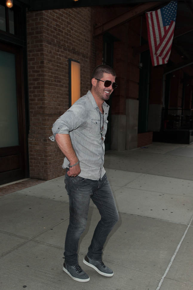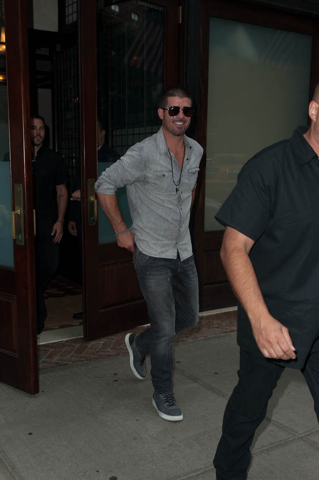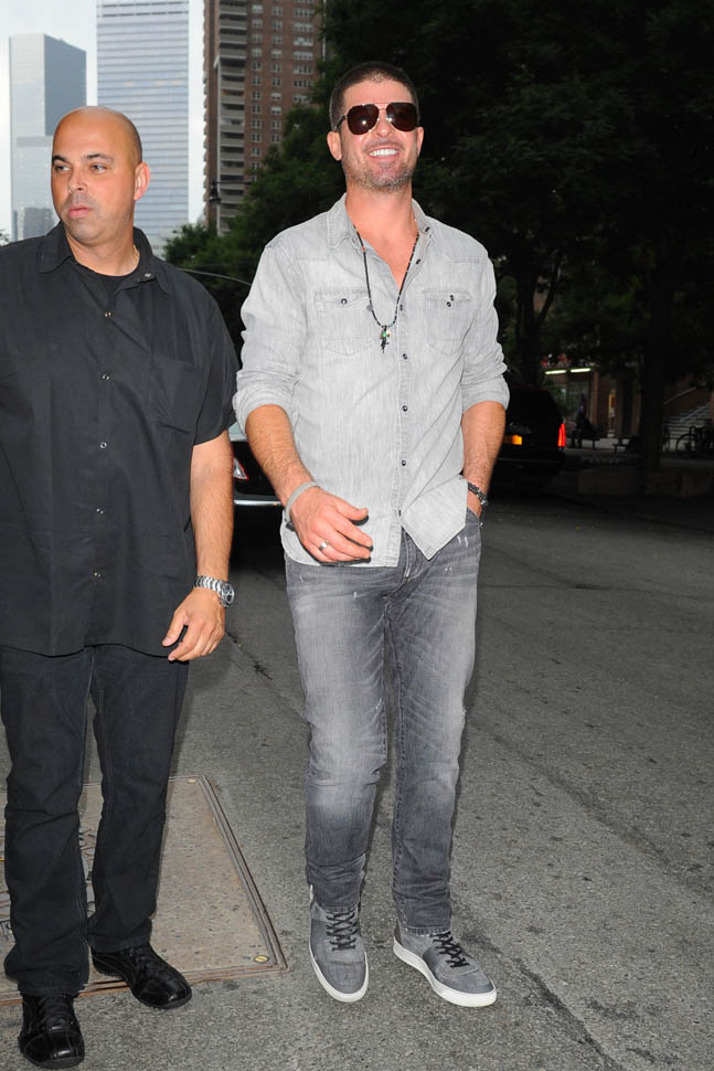 Here are some shots of Robin Thicke leaving his NYC hotel yesterday. God he’s a scuzzy looking f-ck, non?
