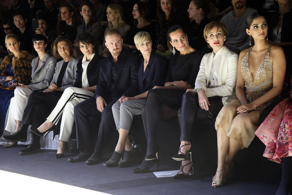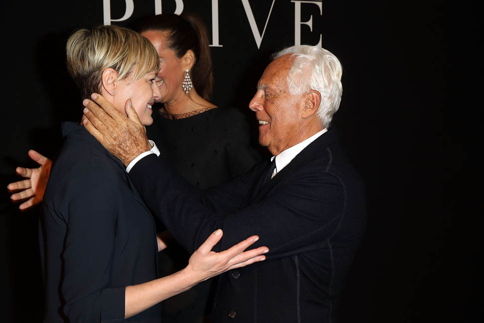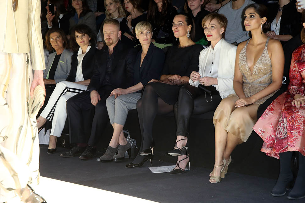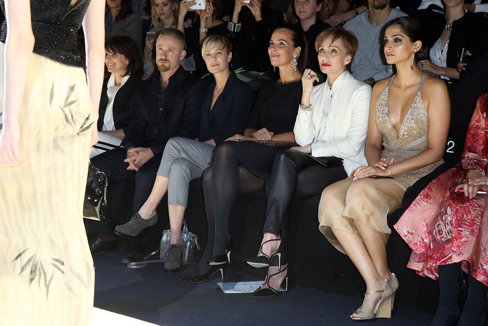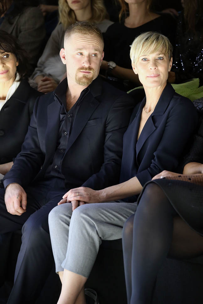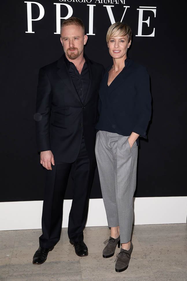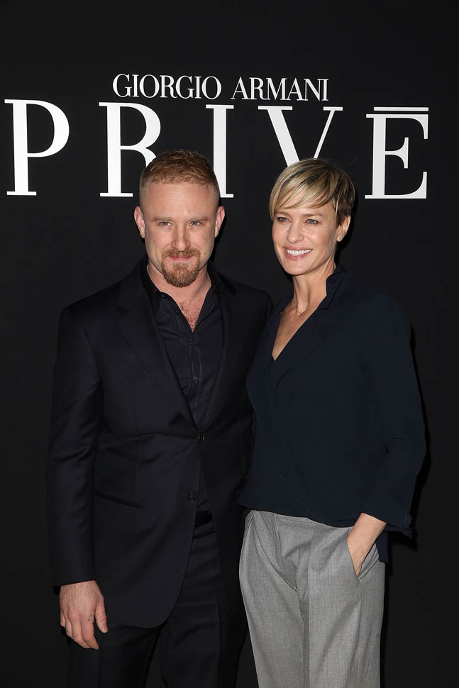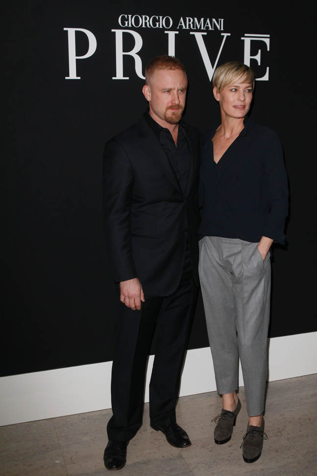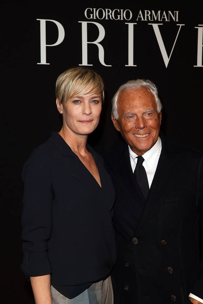 Robin Wright and Ben Foster were in Paris yesterday for the Armani Prive presentation. As you can see, Mr Armani seems quite fond of her. It’s the second time we’ve seen Robin and Ben at a public event this month. You’ll recall, he accompanied her to the Golden Globes. And we were all photo and video assuming their body language, particularly during cutaways throughout the show. Some of you thought there might be some tension. The way I saw it, maybe that’s just how their relationship works.