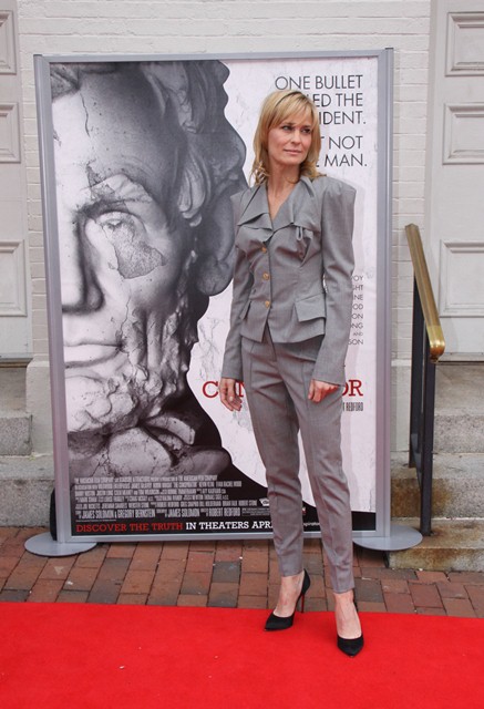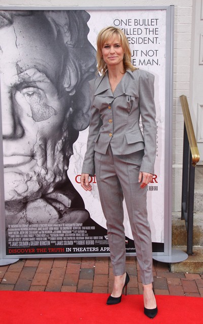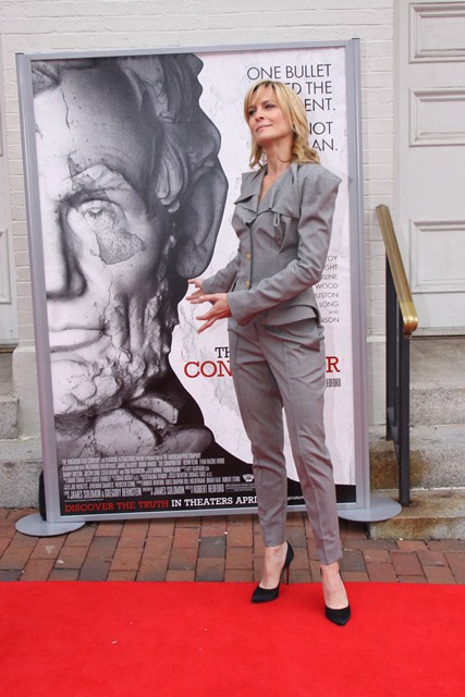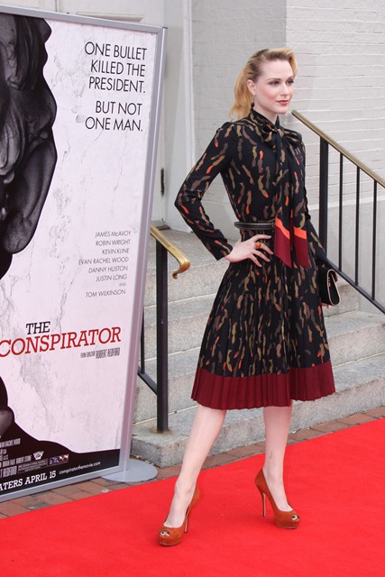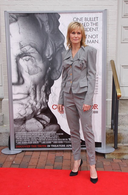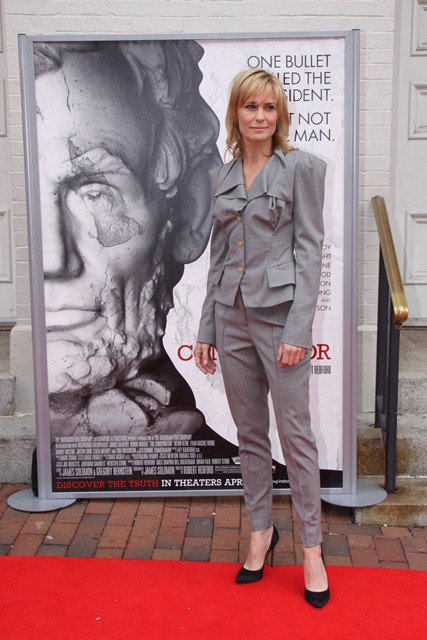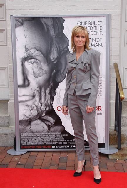Robin Wright, James McAvoy, and Evan Rachel Wood were in Washington, DC yesterday for the premiere of The Conspirator at Ford’s Theatre. The film is about Lincoln’s assassination and the only female co-conspirator (played by Wright) charged with plotting the President’s murder.