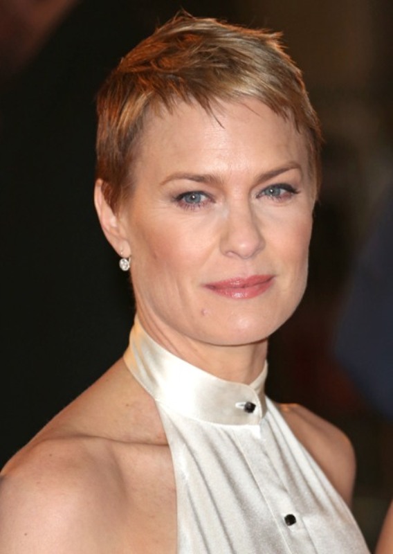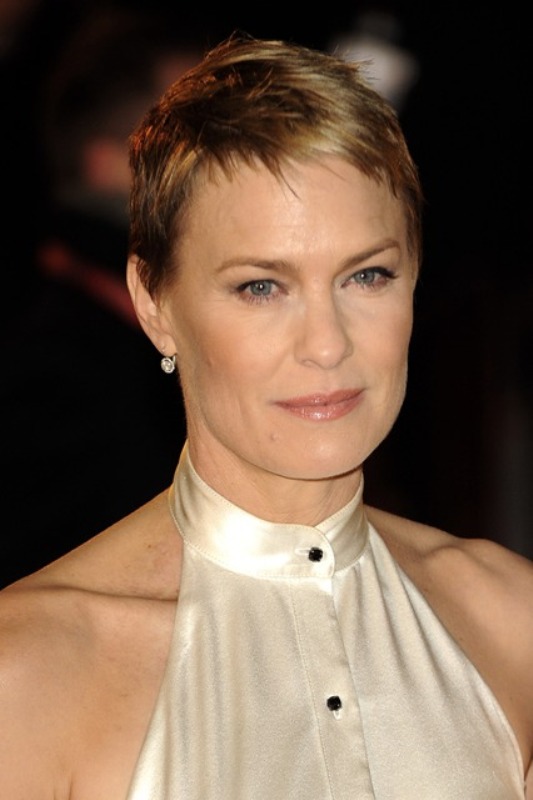 What a difference in high collars – see previous Renee Zellweger example. Oh my God I hate this dress so much. I hate the unflattering sateen top. I hate the way the inverted “V” of the black part below. I hate the lace edging. I hate the buttons. I hate that Robin Wright is wearing it when she could have killed in something so much better.