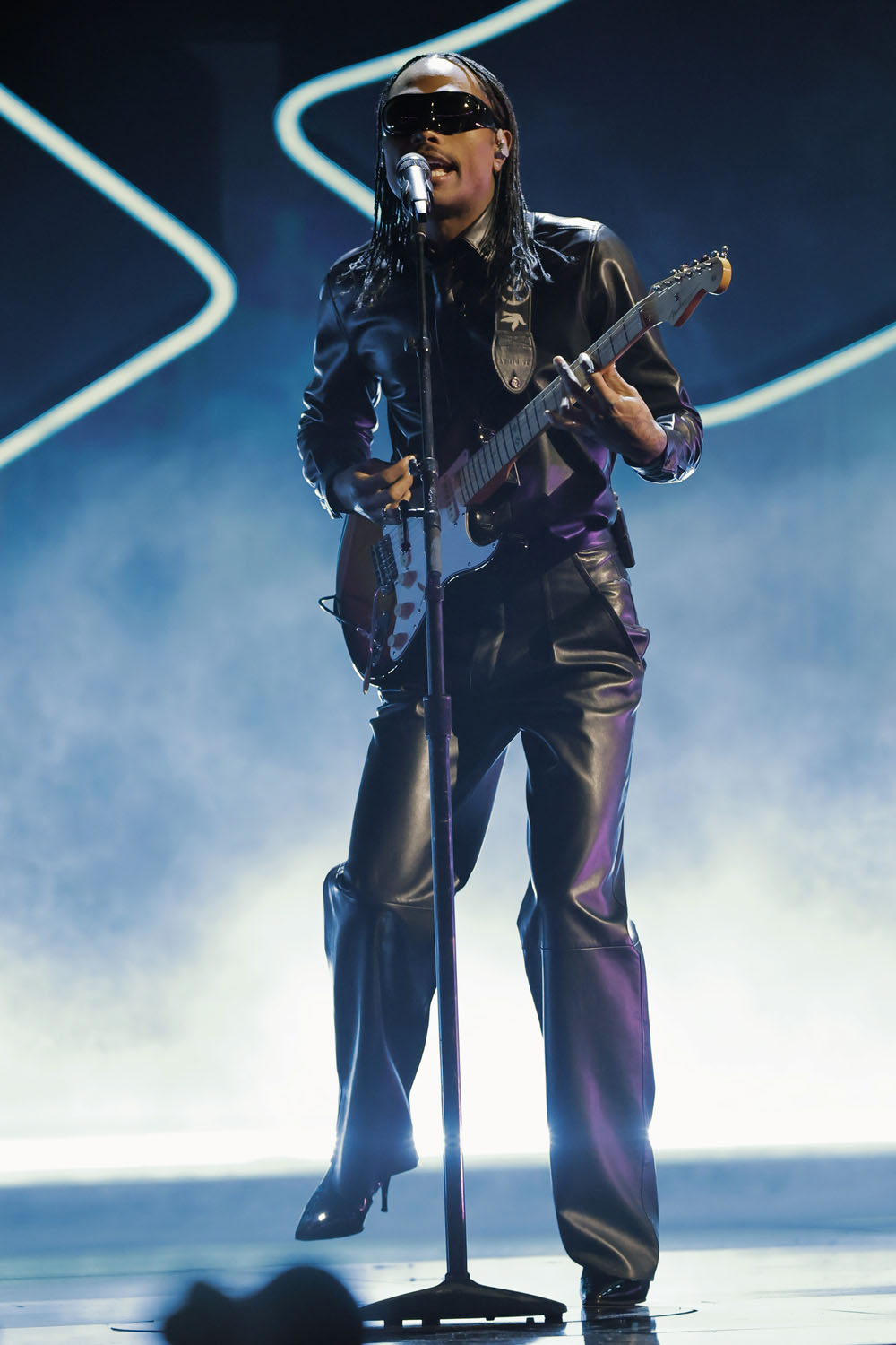 A leather suit and a clutch and the stilettos and he performed in those stilettos like they were sneakers and it was just the right amount of rock and roll and glam rock and street and it’s just so exciting to see him rise. In style.