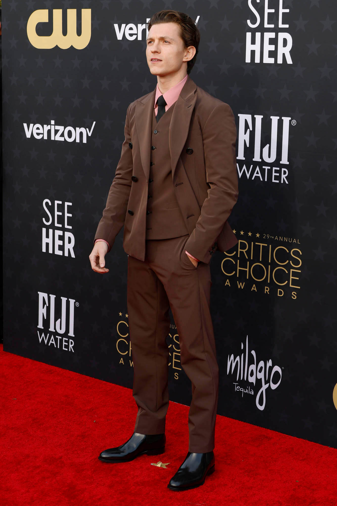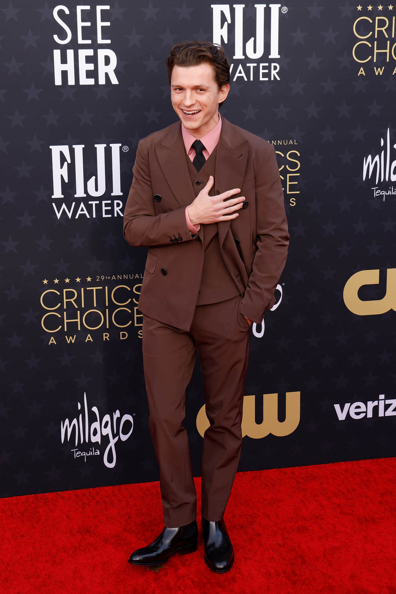 It’s been a minute since we’ve seen Tom Holland on an award show red carpet. He was at Critics Choice last night as a nominee for The Crowded Room. I like the brown and pink combination – very handsome. And I also like that he gave the internet something to squeal about. A few things, actually.