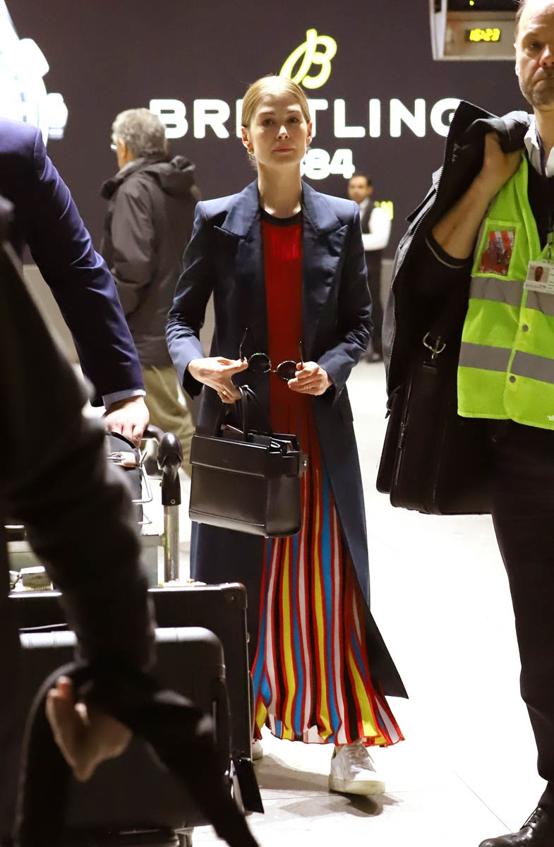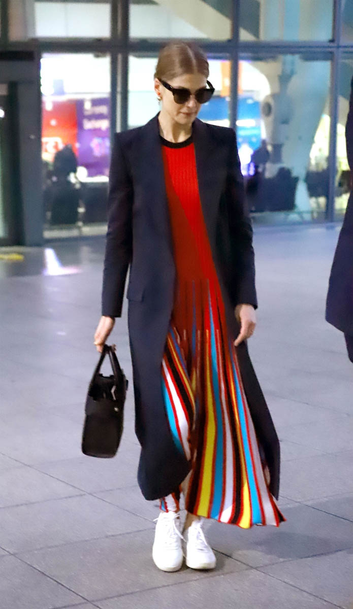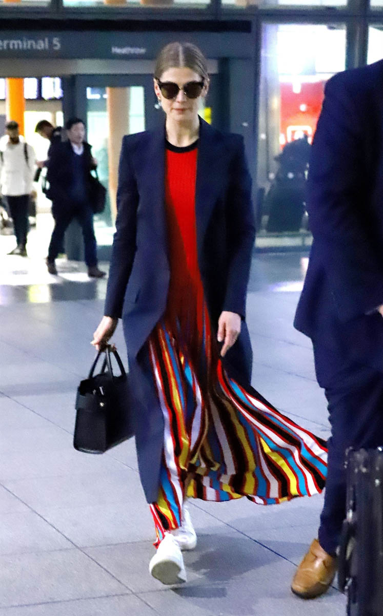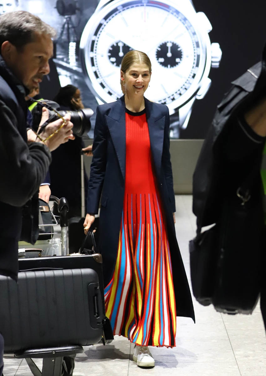 As we all said in our Golden Globes wrap-up on Monday, Rosamund Pike’s Givenchy was … I mean it could have easily been Best Dressed, it just seems … too easy, so easy. Just like this outfit, a travel outfit, she was seen in the other day at Heathrow.