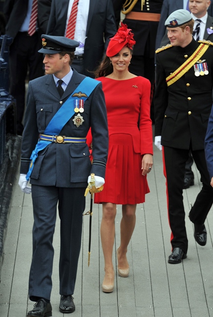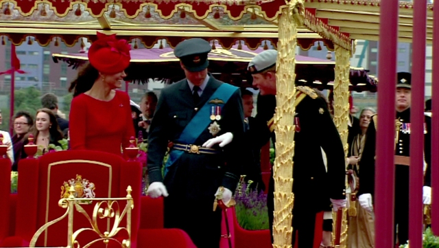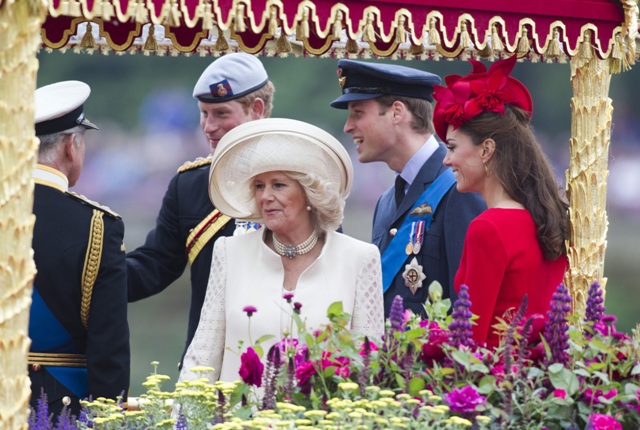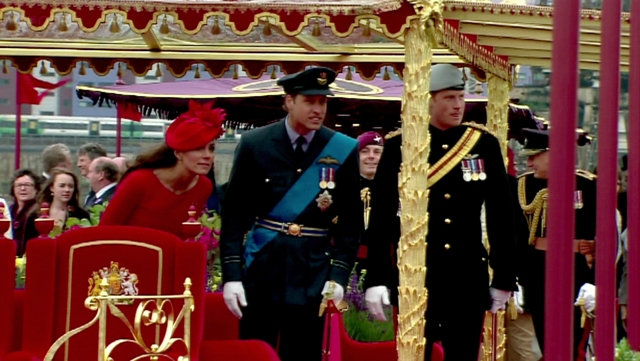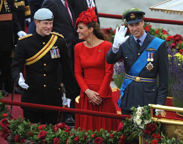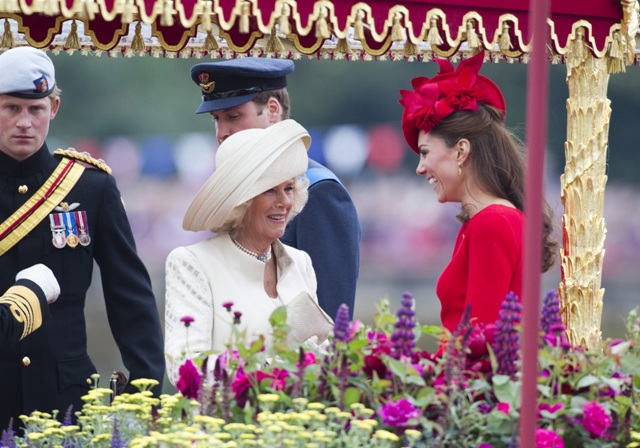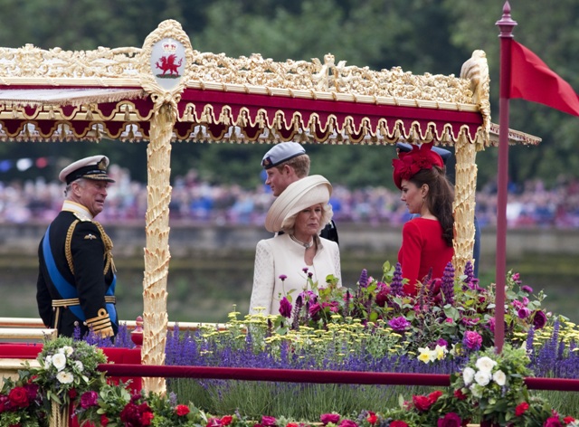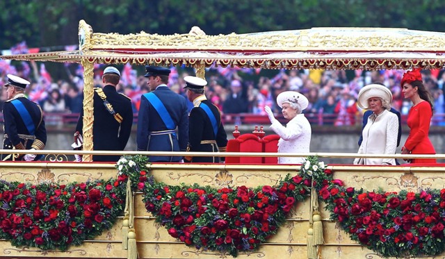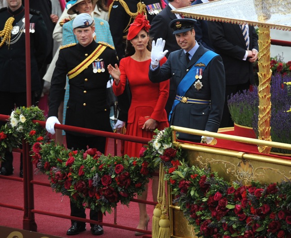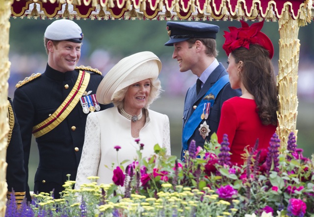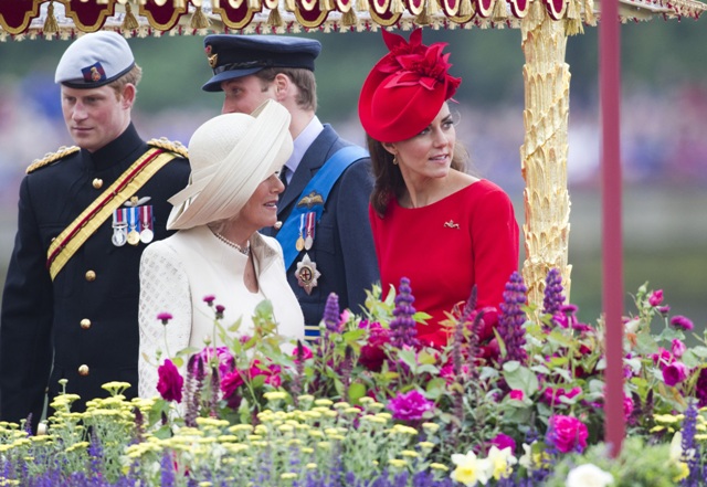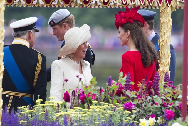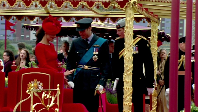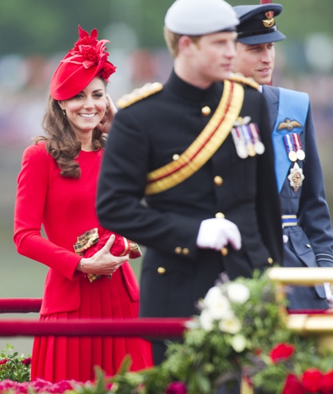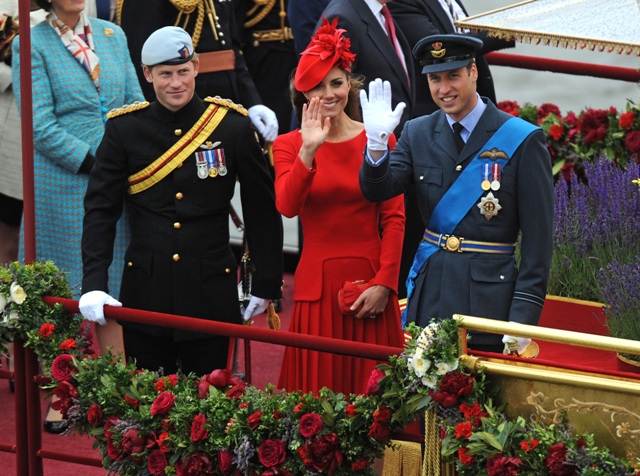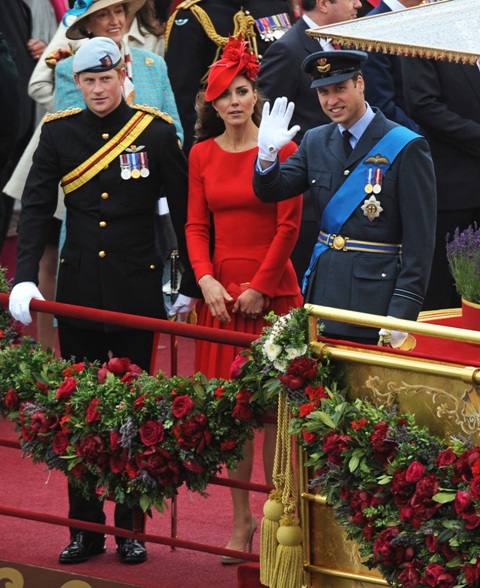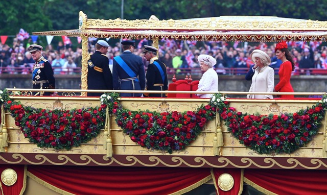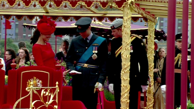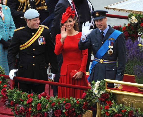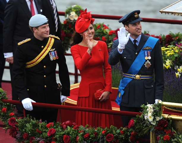 And here they are, the 2nd and 3rd in line to the Throne, with the Queen on her Queen Boat yesterday during the record setting Jubilee Flotilla, part of the senior royal contingent selected to ride with Her during the cruise. That also, obviously, included Catherine Cambridge in red. I know the colour had to have been approved by the Queen herself and if the Queen really hated it she would have said so...but then again, why put a grandmother in that position, right? Maybe it’s just me. I am not a fan of the red dress. Not on the red carpet and not on a red boat and not as the most eye-catching contrast to Her Majesty’s sparkling white.