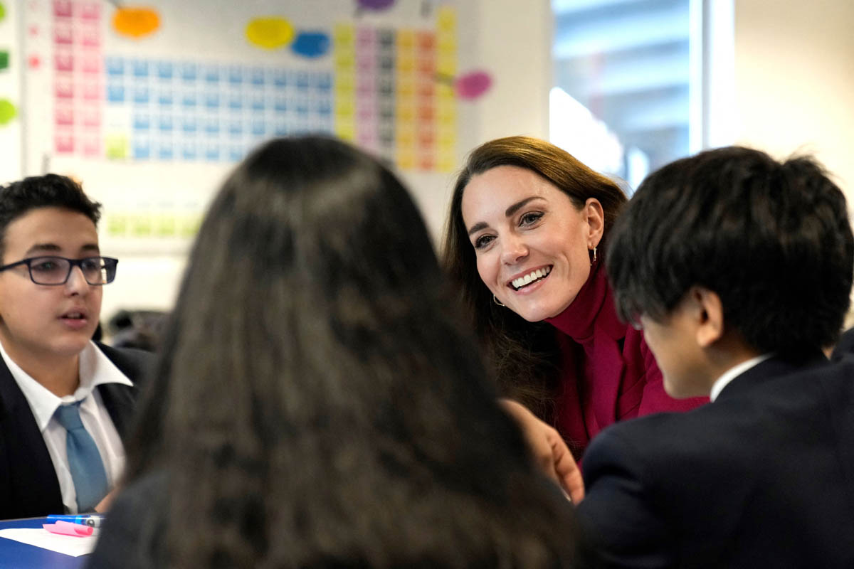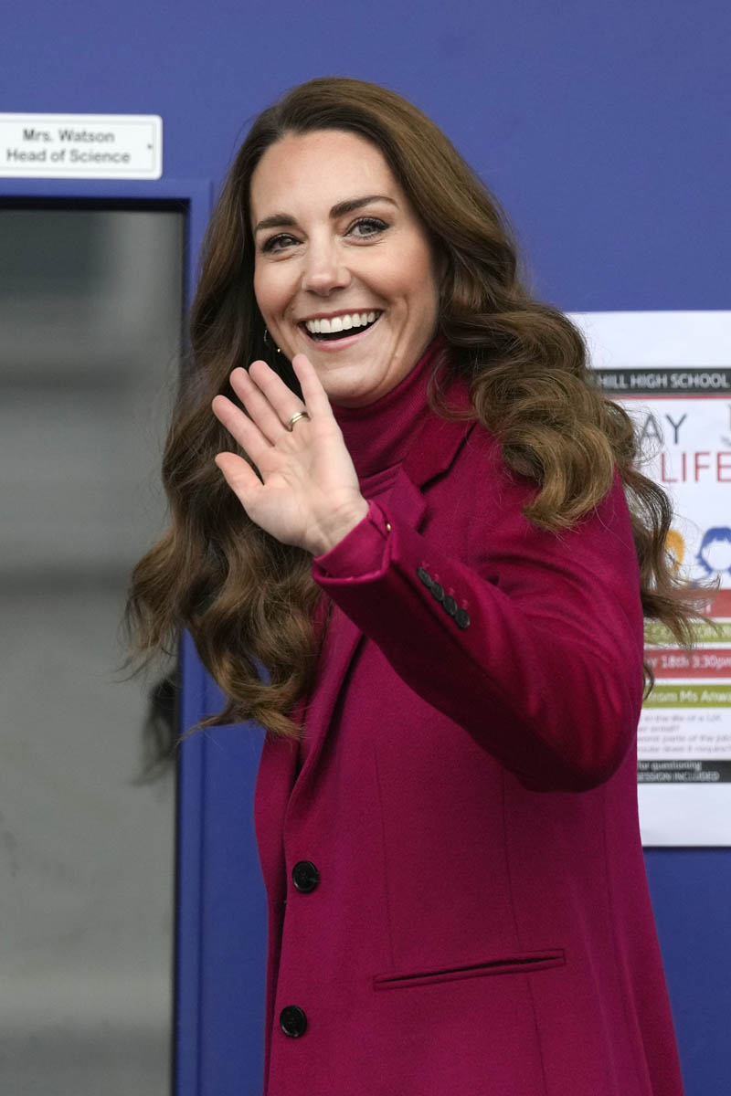 Attached – here’s Kate yesterday visiting Nower Hill High School in London.