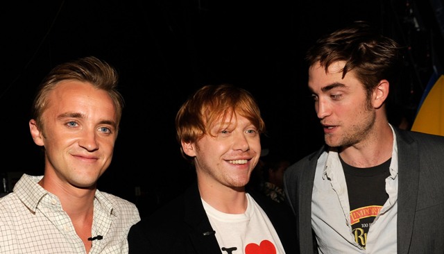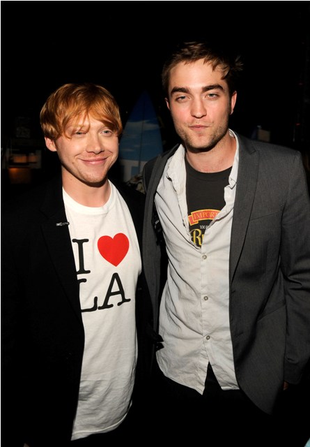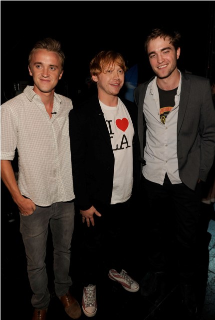 A reader called Tina just sent me a photo of a little Harry Potter reunion that happened at the Teen Choice Awards last night. I opened the message to find Rupert Grint, Robert Pattinson, and Tom Felton gathered backstage. Cute, right? (Lorella - check the slope.)