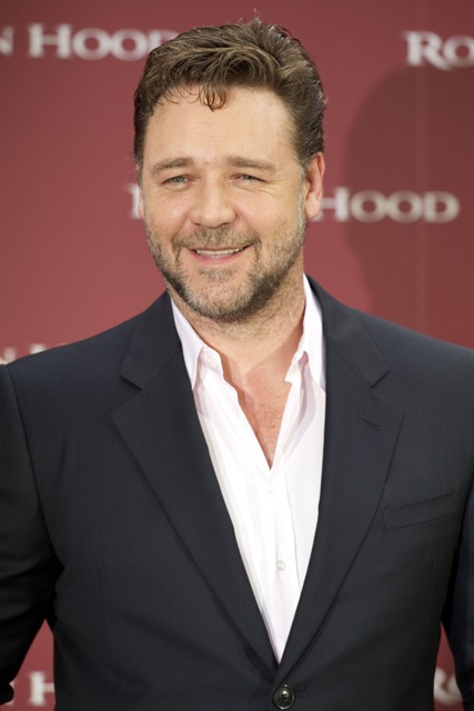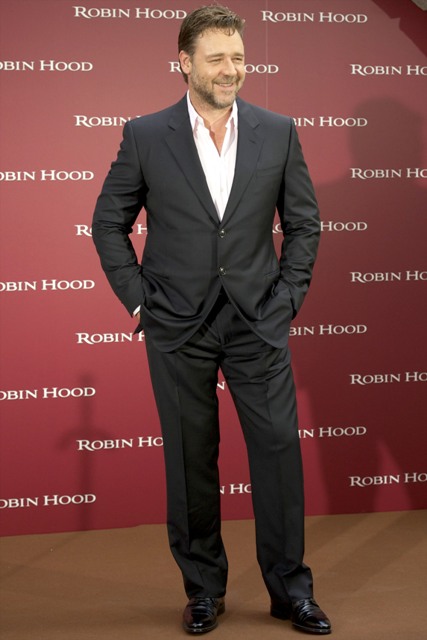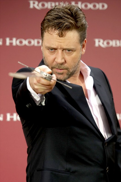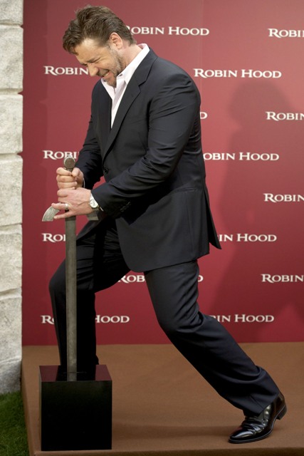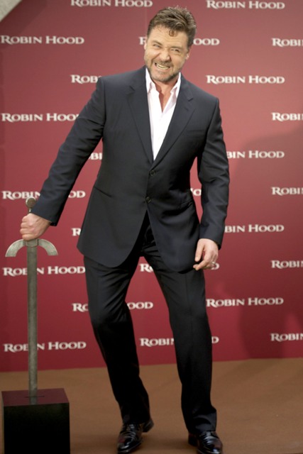 The Robin Hood promotional campaign begins. This is Russell Crowe in Spain today in remarkably good spirits – for him – at the photo call posing with a sword. Gimmicky but since he’s ordinarily such a truculent motherf-cker but it’s a refreshing side of him that we could stand to see more often. Besides, he’s in sell mode. And there is a lot of money riding on Robin Hood to say nothing of the notion that Russell Crowe might not be The Russell Crowe anymore. Which is why there’s a war weapon back in his hand instead of a telephone.
