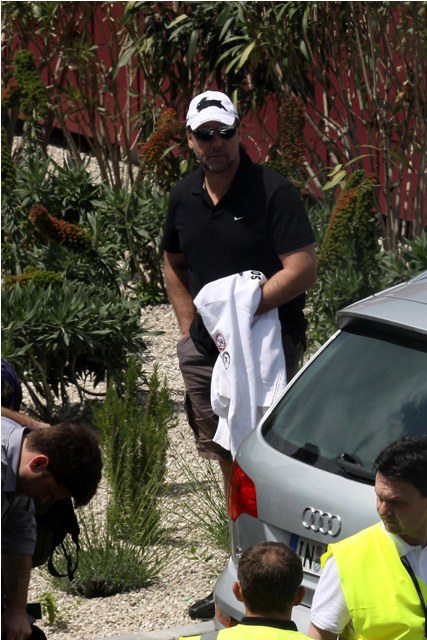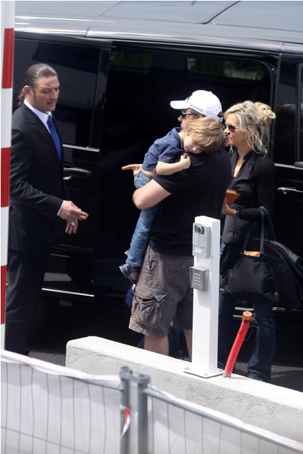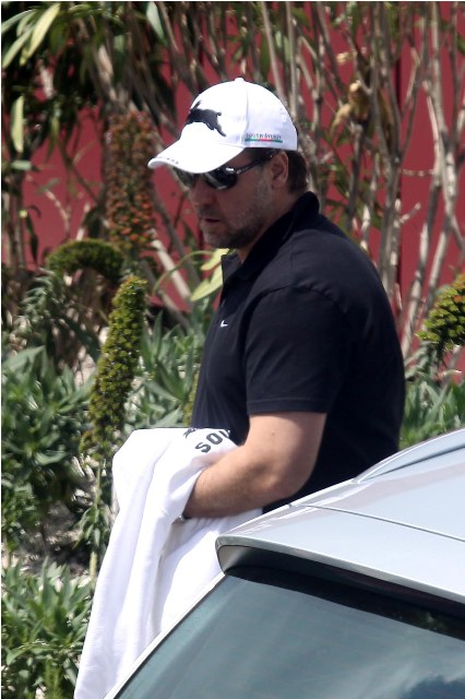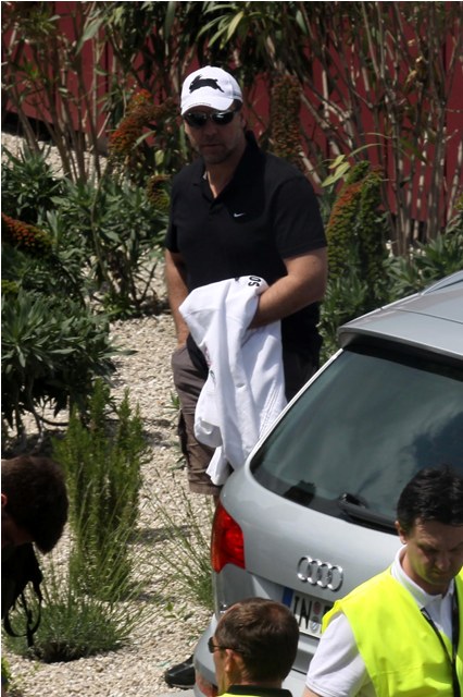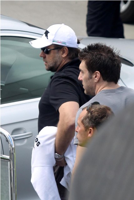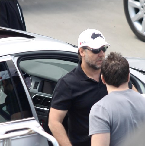 Here's Russell Crowe preparing to leave France with his family after attending Cannes.