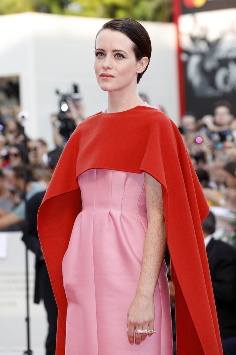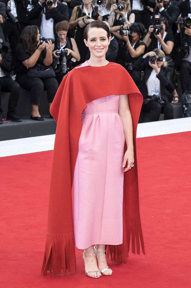 Ryan’s costar, Claire Foy, meanwhile, wore Valentino. What makes the overall outfit special is the red scarf-cape, creating a really interesting, deconstructed silhouette that works so well to shake up and modernise the classic cut of the pink dress. The timelessness of the dress is maintained. But the red accent totally updates it for now. Excellent styling.