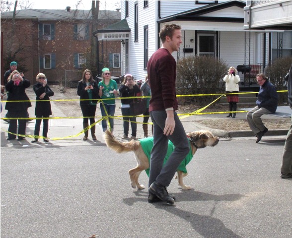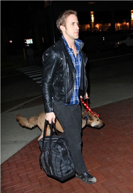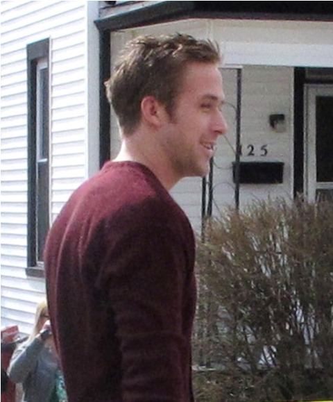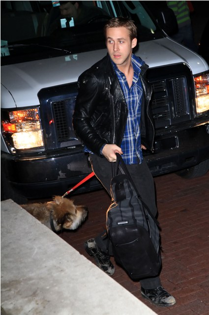 Anyway, here’s Ryan Gosling last night in Oxford, Ohio arriving at the hotel with his dog. Earlier today Ryan dressed Ralph up on set in green to honour Miami University’s Green Beer Day.
